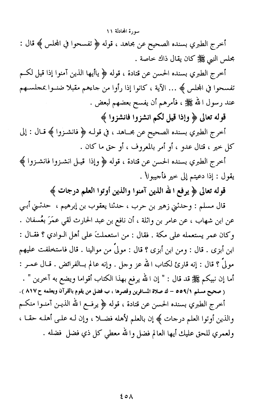 أخرج الطبري بسنده الحسن عن قتادة، قوله (يرفع الله الذين آمنوا منكم والذين أوتوا العلم درجات) إن بالعلم لأهله فضلا، وإن له على أهله حقا، ولعمري للحق عليك أيها العالم فضل والله معطي كل ذي فضل فضله.