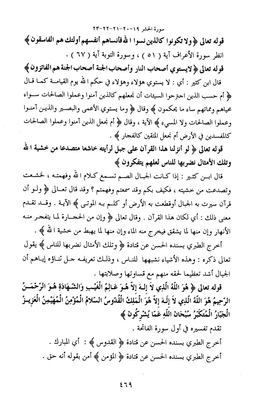 تقوله تعالى (هُوَ اللَّهُ الَّذِي لَا إِلَهَ إِلَّا هُوَ عَالِمُ الْغَيْبِ وَالشَّهَادَةِ هُوَ الرَّحْمَنُ الرَّحِيمُ (22) هُوَ اللَّهُ الَّذِي لَا إِلَهَ إِلَّا هُوَ الْمَلِكُ الْقُدُّوسُ السَّلَامُ الْمُؤْمِنُ الْمُهَيْمِنُ الْعَزِيزُ الْجَبَّارُ الْمُتَكَبِّرُ سُبْحَانَ اللَّهِ عَمَّا يُشْرِكُونَ)