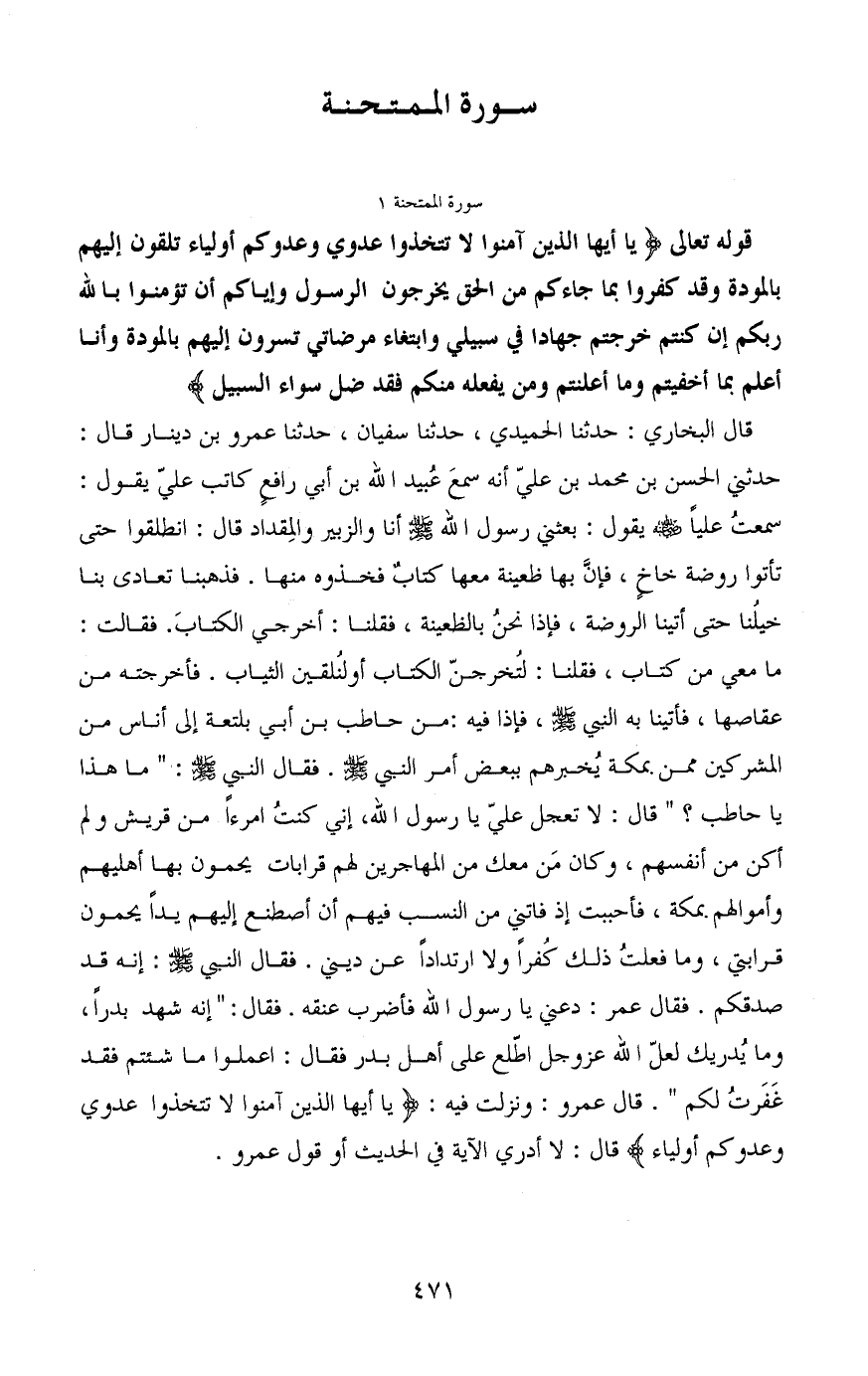 قال البخاري: حدثنا الحميدي، حدثنا سفيان، حدثنا عمرو بن دينار قال: حدثني الحسن بن محمد بن عليّ أنه سمعَ عُبيد الله بن أبي رافعٍ كاتب عليّ يقول: سمعت علياً - رضي الله عنه - يقول: بعثني رسول الله - صَلَّى اللَّهُ عَلَيْهِ وَسَلَّمَ - أنا والزبير والمِقداد قال: انطلقوا حتى تأتوا روضة خاخٍ، فإن بها ظعينة معها كتابٌ فخذوه منها. فذهبنا تعادى بنا خيلُنا حتى أتينا الروضة، فإذا نحنُ بالظعينة، فقلنا: أخرجي الكتابَ. فقالت: ما معي من كتاب، فقلنا: لتُخرجنّ الكتاب أو لتُلقين الثياب. فأخرجته من عقاصها، فأتينا به النبي - صَلَّى اللَّهُ عَلَيْهِ وَسَلَّمَ -، فإذا فيه: من حاطب بن أبي بلتعة إلى أناس من المشركين ممن بمكة يُخبرهم ببعض أمر النبي - صَلَّى اللَّهُ عَلَيْهِ وَسَلَّمَ -. فقال النبي - صَلَّى اللَّهُ عَلَيْهِ وَسَلَّمَ -: "ما هذا يا حاطب؟ " قال: لا تعجل علىّ يا رسول الله، إني كنتُ امرءاً من قريش ولم أكن من أنفسهم، وكان مَن معك من المهاجرين لهم قرابات يحمون بها أهليهم وأموالهم بمكة، فأحببت إذ فاتني من النسب فيهم أن أصطنع إليهم يداً يحمون قرابتي، وما فعلتُ ذلك كفراً ولا ارتداداً عن ديني. فقال النبي - صَلَّى اللَّهُ عَلَيْهِ وَسَلَّمَ -: إنه قد صدقكم. فقال عمر: دعني يا رسول الله فأضرب عنقه. فقال: "إنه شهد بدراً، وما يُدريك لعلّ الله عز وجل اطّلع على أهل بدر فقال: اعملوا ما شئتم فقد غَفَرتُ لكم". قال عمرو: ونزلت فيه: (يا أيها الذين آمنوا لا تتخذوا عدوي وعدوكم أولياء) قال: لا أدري الآية في الحديث أو قول عمرو.