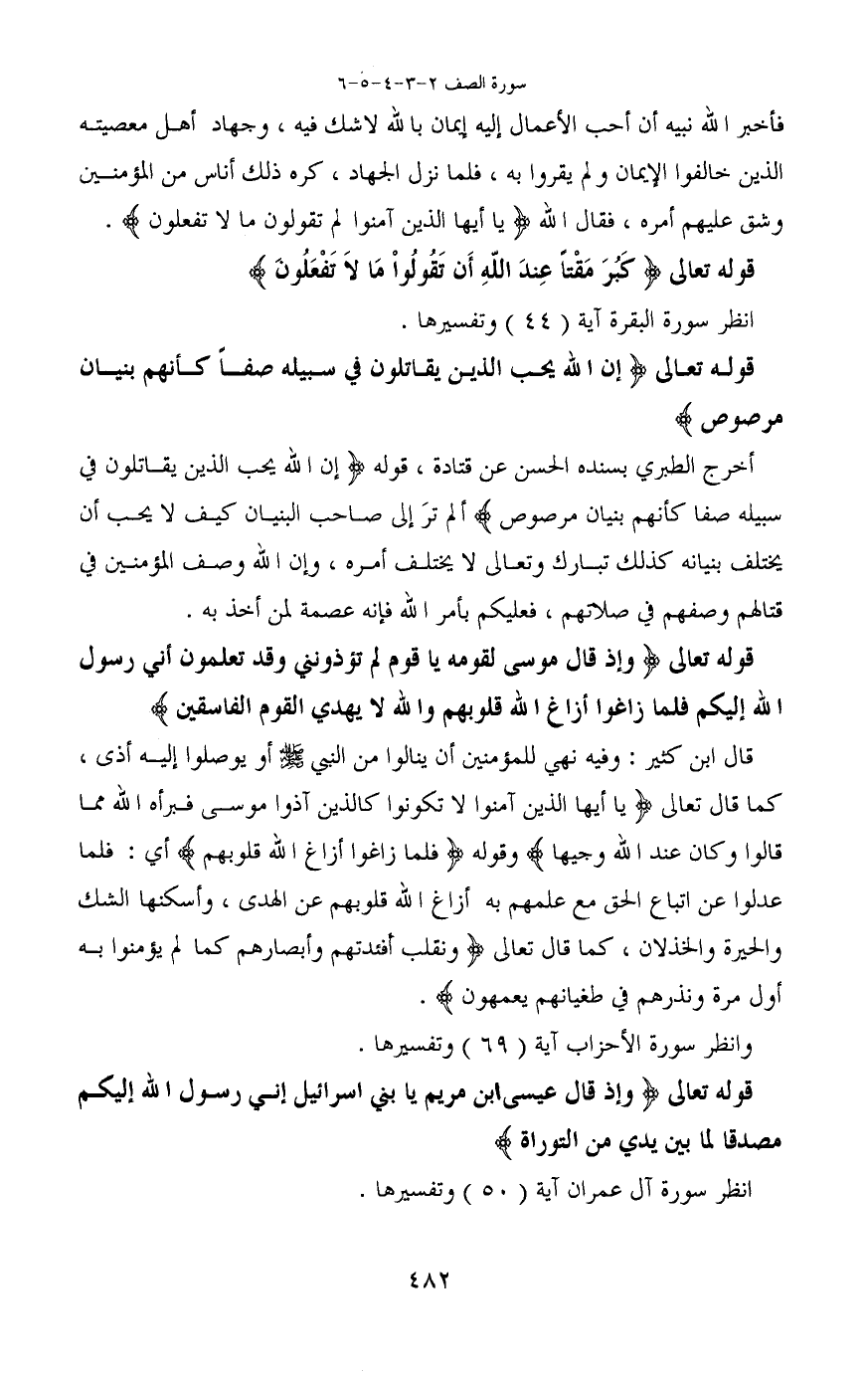 أخرج الطبري بسنده الحسن عن قتادة، قوله (إن الله يحب الذين يقاتلون في سبيله صفا كأنهم بنيان مرصوص) ألم ترَ إلى صاحب البنيان كيف لا يحب أن يختلف بنيانه كذلك تبارك وتعالى لا يختلف أمره، وإن الله وصف المؤمنين في قتالهم وصفهم في صلاتهم، فعليكم بأمر الله فإنه عصمة لمن أخذ به.