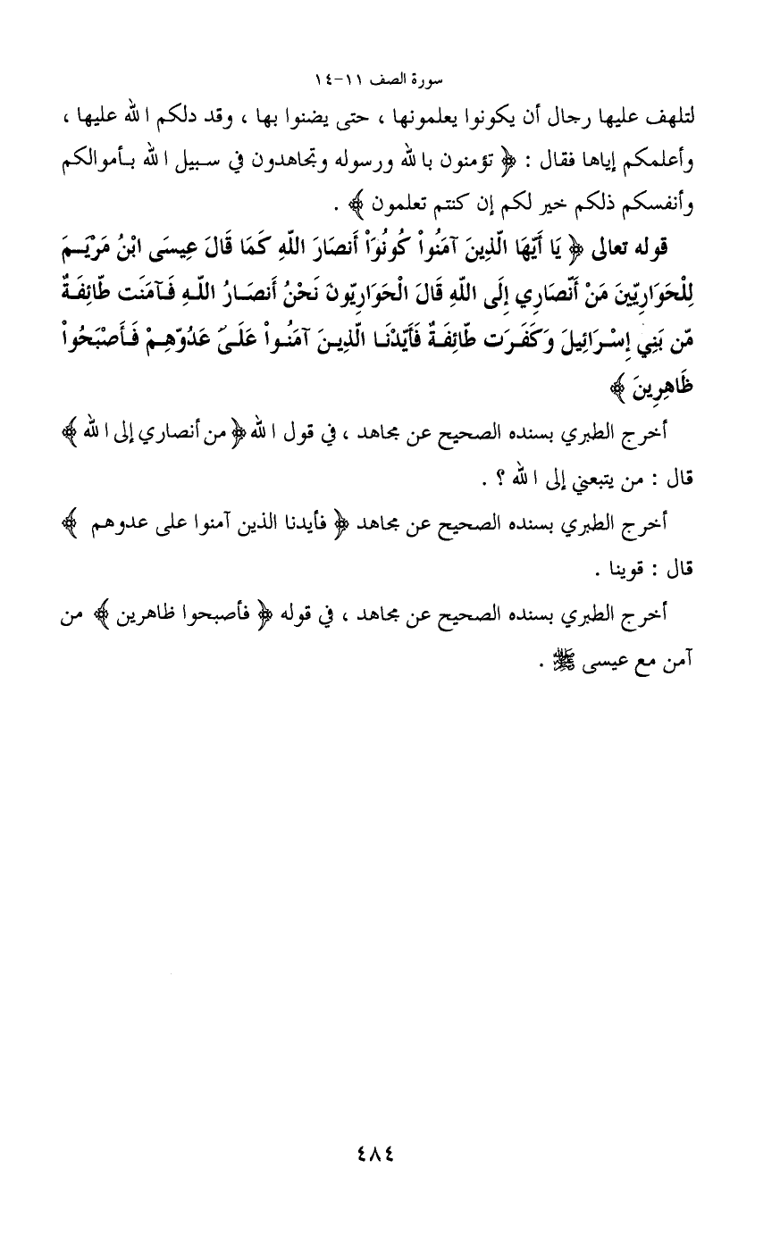 قوله تعالى (يَا أَيُّهَا الَّذِينَ آمَنُوا كُونُوا أَنْصَارَ اللَّهِ كَمَا قَالَ عِيسَى ابْنُ مَرْيَمَ لِلْحَوَارِيِّينَ مَنْ أَنْصَارِي إِلَى اللَّهِ قَالَ الْحَوَارِيُّونَ نَحْنُ أَنْصَارُ اللَّهِ فَآمَنَتْ طَائِفَةٌ مِنْ بَنِي إسرائيل وَكَفَرَتْ طَائِفَةٌ فَأَيَّدْنَا الَّذِينَ آمَنُوا عَلَى عَدُوِّهِمْ فَأَصْبَحُوا ظَاهِرِينَ)
