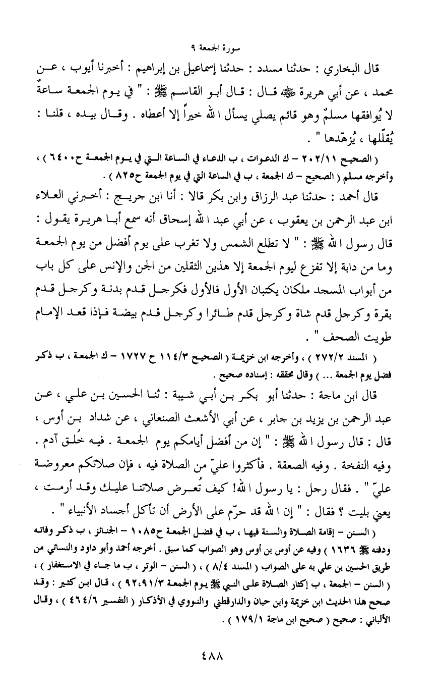 ودفنه - صَلَّى اللَّهُ عَلَيْهِ وَسَلَّمَ - 1636) وفيه عن أوس بن أوس وهو الصواب كما سبق. أخرجه أحمد وأبو داود والنسائي من طريق الحسين بن علي به على الصواب (المسند 4/8) ، (السنن - الوتر، ب ما جاء في الاستغفار) ، (السنن - الجمعة، ب إكثار الصلاة على النبي - صَلَّى اللَّهُ عَلَيْهِ وَسَلَّمَ - يوم الجمعة 3/91، 92) ، قال ابن كثير: وقد صحح هذا الحديث ابن خزيمة وابن حبان والدارقطني والنووي في الأذكار (التفسير 6/464) ، وقال الألبانى: صحيح (صحيح ابن ماجة 1/179) .