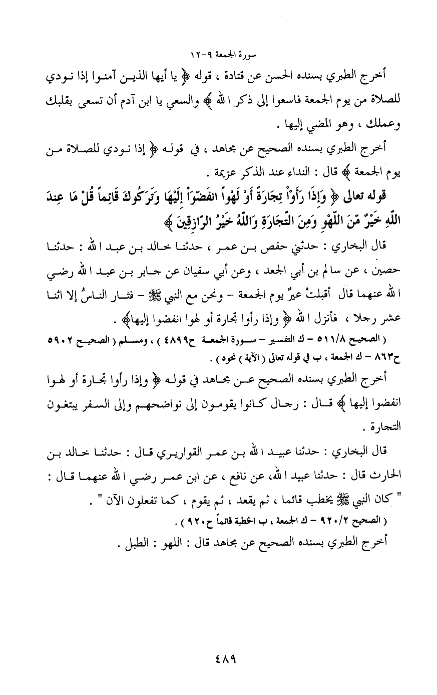 قال البخاري: حدثني حفص بن عمر، حدثنا خالد بن عبد الله: حدثنا حصين، عن سالم بن أبي الجعد، وعن أبي سفيان عن جابر بن عبد الله رضي الله عنهما قال أقبلتْ عيرّ يوم الجمعة - ونحن مع النبي - صَلَّى اللَّهُ عَلَيْهِ وَسَلَّمَ - فثار الناسُ إلا اثنا عشر رجلا، فأنزل الله (وإذا رأوا تجارة أو لهوا انفضوا إليها) .