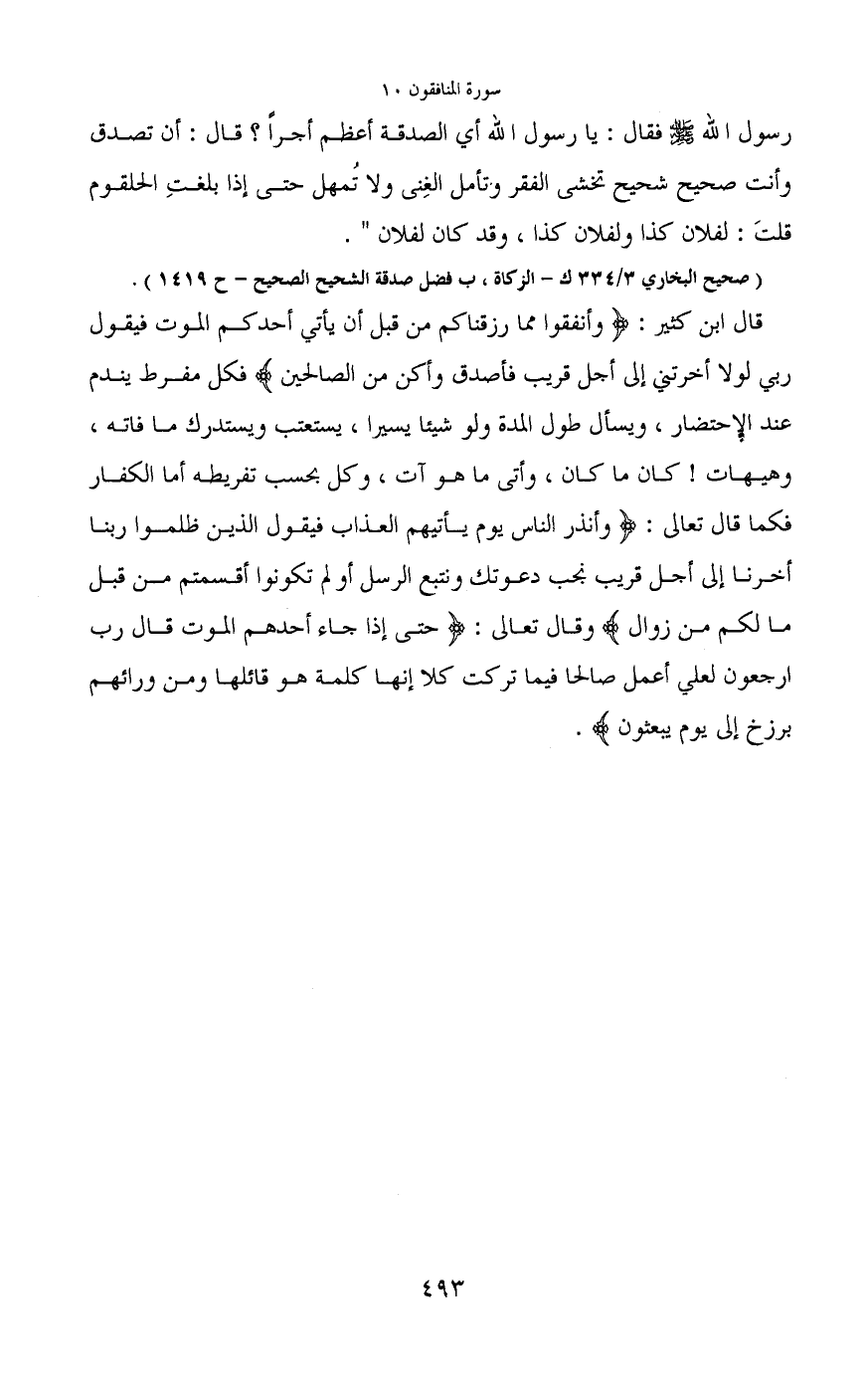 قال ابن كثير: (وأنفقوا مما رزقناكم من قبل أن يأتي أحدكم الموت فيقول ربي لولا أخرتني إلى أجل قريب فأصدق وأكن من الصالحين) فكل مفرط يندم عند الإحتضار، ويسأل طول المدة ولو شيئا يسيرا، يستعتب ويستدرك ما فاته، وهيهات! كان ما كان، وأتى ما هو آت، وكل بحسب تفريطه أما الكفار فكما قال تعالى: (وأنذر الناس يوم يأتيهم العذاب فيقول الذين ظلموا ربنا أخرنا إلى أجل قريب نجب دعوتك ونتبع الرسل أولم تكونوا أقسمتم من قبل ما لكم من زوال) وقال تعالى: (حتى إذا جاء أحدهم الموت قال رب ارجعون لعلي أعمل صالحا فيما تركت كلا إنها كلمة هو قائلها ومن ورائهم برزخ إلى يوم يبعثون) .