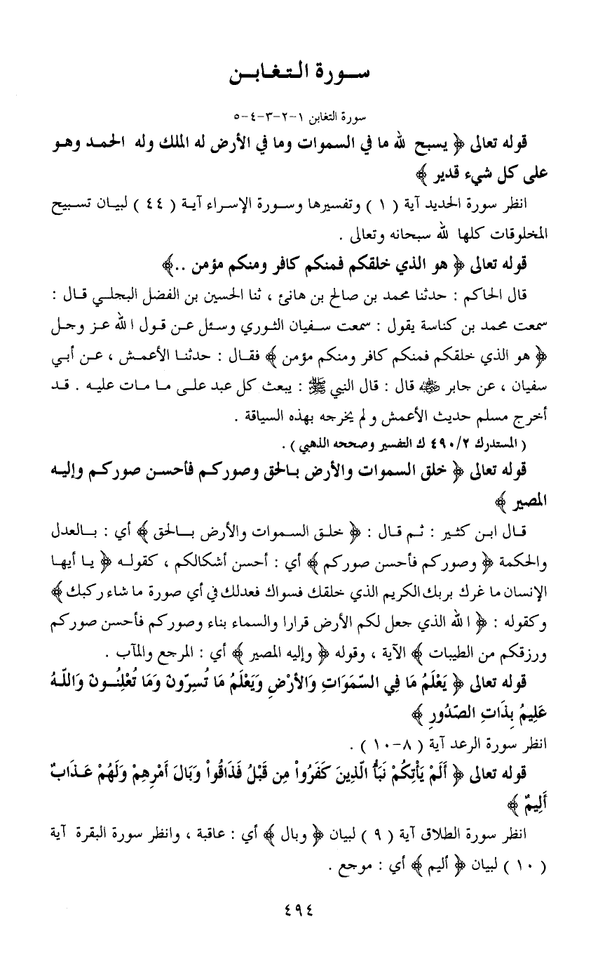 قال الحاكم: حدثنا محمد بن صالح بن هانئ، ثنا الحسين بن الفضل البجلي قال: سمعت محمد بن كناسة يقول: سمعت سفيان الثوري وسئل عن قول الله عز وجل (هو الذي خلقكم فمنكم كافر ومنكم مؤمن) فقال: حدثنا الأعمش، عن أبي سفيان، عن جابر - رضي الله عنه - قال: قال النبي - صَلَّى اللَّهُ عَلَيْهِ وَسَلَّمَ -: يبعث كل عبد على ما مات عليه. قد أخرج مسلم حديث الأعمش ولم يخرجه بهذه السياقة.