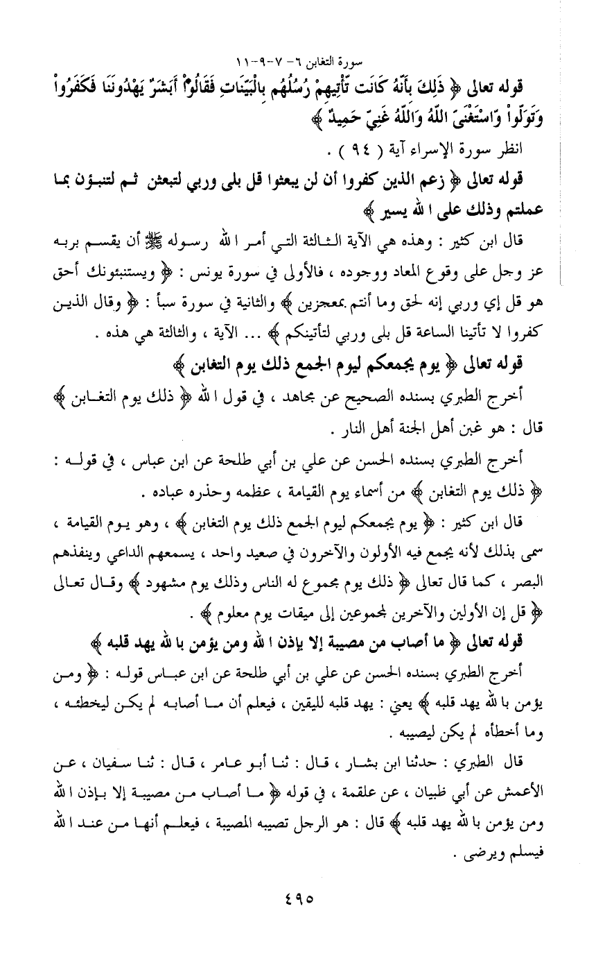قال الطبري: حدثنا ابن بشار، قال: ثنا آبو عامر، قال: ثنا سفيان، عن الأعمش عن أبي ظبيان، عن علقمة، في قوله (ما أصاب من مصيبة إلا بإذن الله ومن يؤمن بالله يهد قلبه) قال: هو الرجل تصيبه المصيبة، فيعلم أنها من عند الله فيسلم ويرضى.
