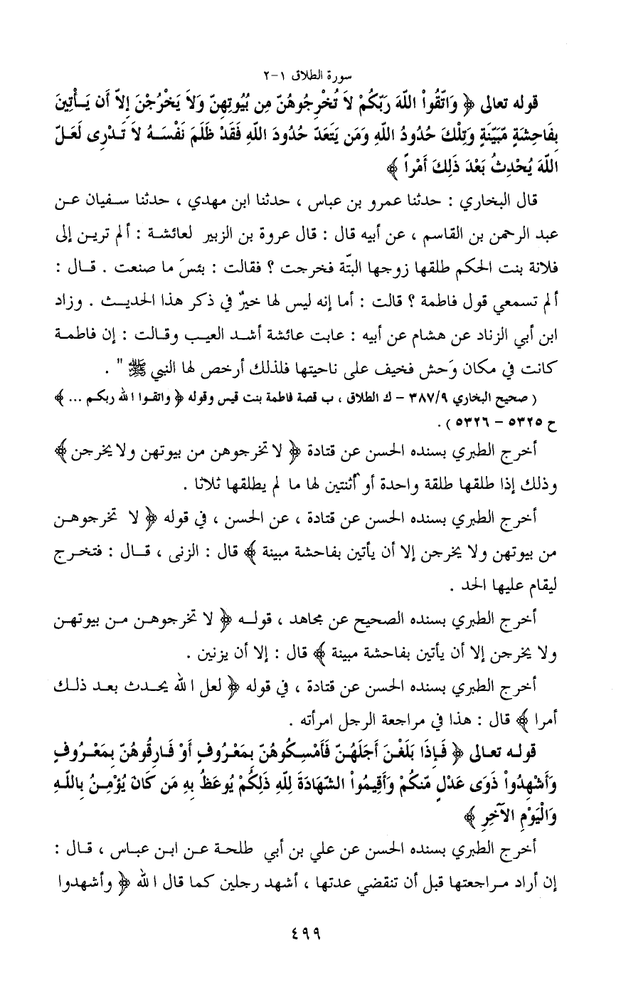 أخرج الطبري) بسنده الحسن عن قتادة (لا تخرجوهن من بيوتهن ولا يخرجن) وذلك إذا طلقها طلقة واحدة أو اثنتين لها ما لم يطلقها ثلاثا.