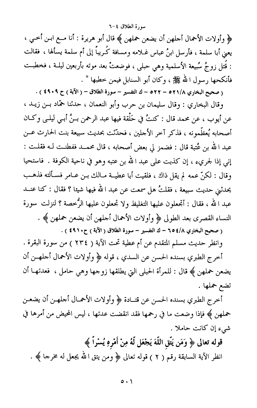 (وأولات الأحمال أجلهن أن يضعن حملهن) قال أبو هريرة: أنا مع ابن أخي، يعني أبا سلمة، فأرسل ابنُ عباس غلامه ومسافة كريباً إلى أم سلمة يسألها، فقالت: قتل زوجُ سُبيعة الأسلمية وهى حبلى، فوضعتْ بعد موته بأربعين ليلة، فخطبت فأنكحها رسول الله - صَلَّى اللَّهُ عَلَيْهِ وَسَلَّمَ -، وكان أبو السنابل فيمن خطبها".