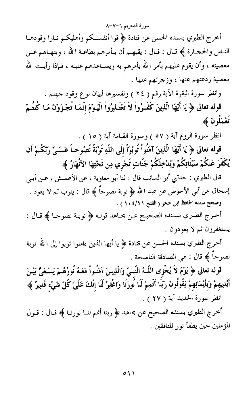 أخرج الطبري بسنده الحسن عن قتادة (يا أيها الذين ءامنوا توبوا إلى الله توبة نصوحاً) قال: هي الصادقة الناصحة.