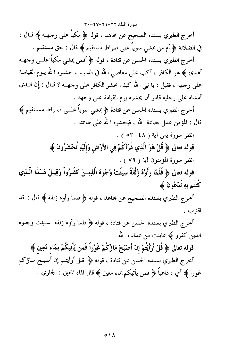 أخرج الطبري بسنده الحسن عن قتادة (يمشي سوياً على صراط مستقيم) قال: المؤمن عمل بطاعة الله، فيحشره الله على طاعته.