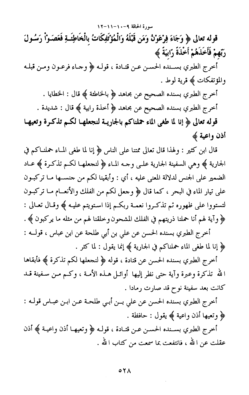 أخرج الطبري بسنده الحسن عن علي بن أبي طلحة عن ابن عباس، قوله: (إنا لما طغى الماء حملناكم في الجارية) إنما يقول: لما كثر.