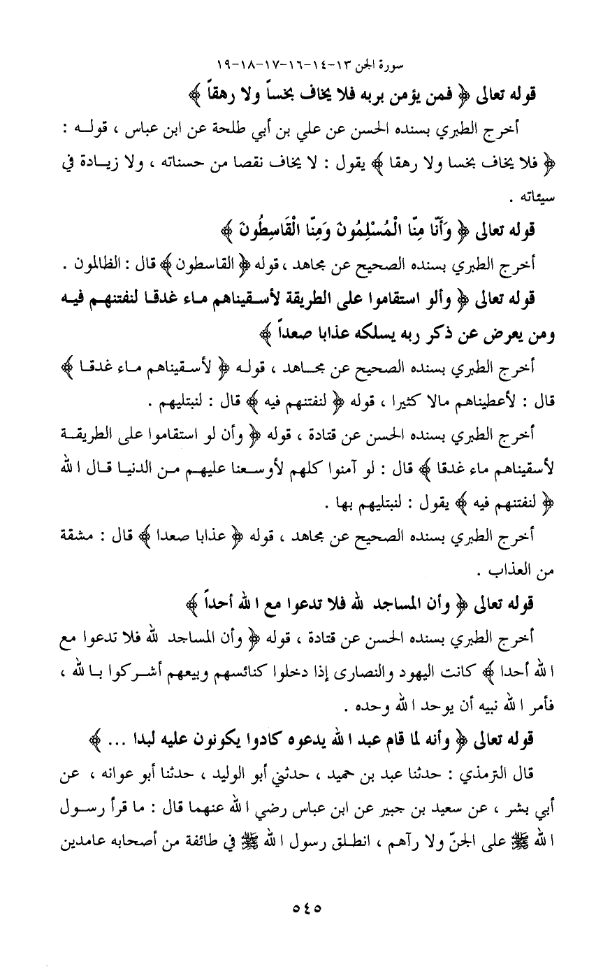 قال الترمذي: حدثنا عبد بن حميد، حدثني أبو الوليد، حدثنا أبو عوانه، عن أبي بشر، عن سعيد بن جبير عن ابن عباس رضي الله عنهما قال: ما قرأ رسول الله - صَلَّى اللَّهُ عَلَيْهِ وَسَلَّمَ - على الجنّ ولا رآهم، انطلق رسول الله في طائفة من أصحابه عامدين
