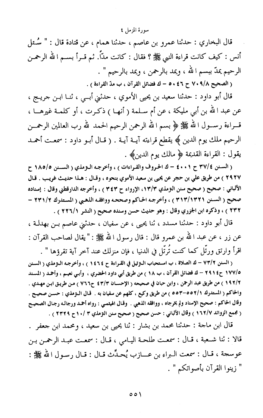 قال البخاري: حدثنا عمرو بن عاصم، حدثنا همام، عن قتادة قال: "سُئل أنس: كيف كانت قراءة النبي - صَلَّى اللَّهُ عَلَيْهِ وَسَلَّمَ -؟ فقال: كانت مدّاً. ثم قرأ بسم الله الرحمن الرحيم يمدّ ببسم الله، ويمد بالرحمن، ويمد بالرحيم".