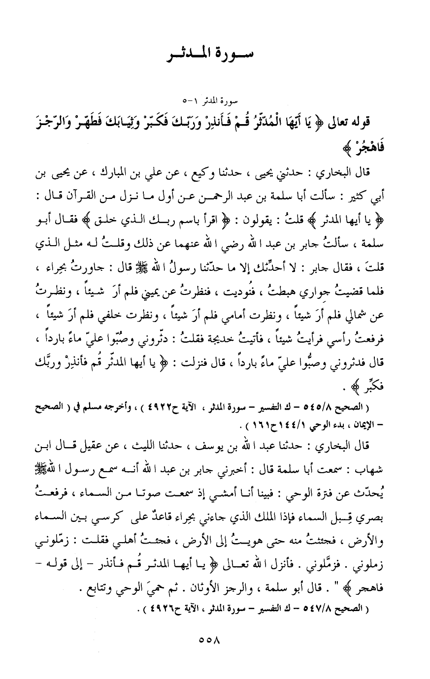 قال البخاري: حدثني يحيى، حدثنا وكيع، عن علي بن المبارك، عن يحيى بن أبي كثير: سألت أبا سلمة بن عبد الرحمن عن أول ما نزل من القرآن قال: (يا أيها المدثر) قلتُ: يقولون: (اقرأ باسم ربك الذي خلق) فقال أبو سلمة، سألتُ جابر بن عبد الله رضي الله عنهما عن ذلك وقلتُ له مثل الذي قلتَ، فقال جابر: لا أحدثك إلا ما حدّثنا رسولُ الله - صلى الله عليه وسلم - قال: جاورتُ بحِراء، فلما قضيتُ جِواري هبطتُ، فنوديت، فنظرتُ عن يميني فلم أرَ شيئا، ونظرتُ عن شمالي فلم أرَ شيئاً، ونظرت أمامي فلم أرَ شيئاً، ونظرت خلفي فلم أرَ شيئاً، فرفعتُ رأسي فرأيتُ شيئا، فأتيتُ خديجة فقلتُ: (دثّروني وصُبّوا علىّ ماءً بارداً، قال فدثروني وصبُّوا عليّ ماءً بارداً، قال فنزلت: (يا أيها المدثّر قم فأنذِرْ وربَّك فكبِّر) .