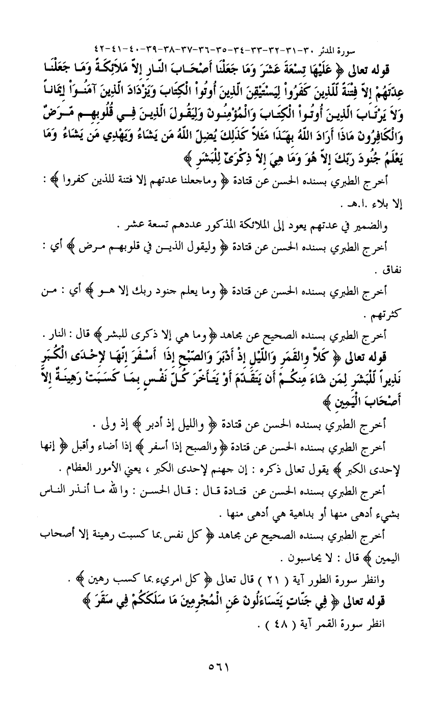 قوله تعالى (عَلَيْهَا تِسْعَةَ عَشَرَ (30) وَمَا جَعَلْنَا أَصْحَابَ النَّارِ إِلَّا مَلَائِكَةً وَمَا جَعَلْنَا عِدَّتَهُمْ إِلَّا فِتْنَةً لِلَّذِينَ كَفَرُوا لِيَسْتَيْقِنَ الَّذِينَ أُوتُوا الْكِتَابَ وَيَزْدَادَ الَّذِينَ آَمَنُوا إِيمَانًا وَلَا يَرْتَابَ الَّذِينَ أُوتُوا الْكِتَابَ وَالْمُؤْمِنُونَ وَلِيَقُولَ الَّذِينَ فِي قُلُوبِهِمْ مَرَضٌ وَالْكَافِرُونَ مَاذَا أَرَادَ اللَّهُ بِهَذَا مَثَلًا كَذَلِكَ يُضِلُّ اللَّهُ مَنْ يَشَاءُ وَيَهْدِي مَنْ يَشَاءُ وَمَا يَعْلَمُ جُنُودَ رَبِّكَ إِلَّا هُوَ وَمَا هِيَ إِلَّا ذِكْرَى لِلْبَشَرِ)