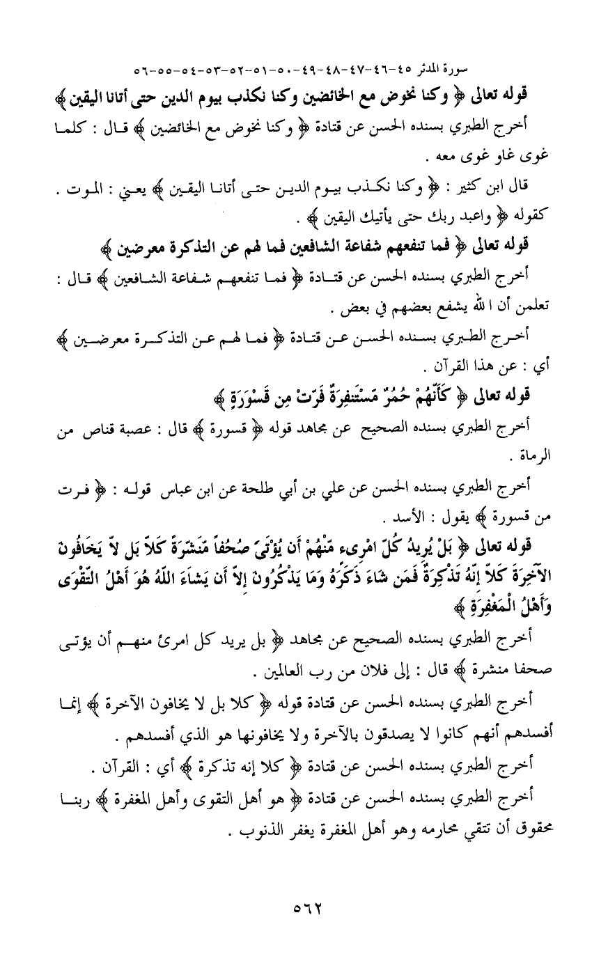 قوله تعالى (وكنا نخوض مع الخائضين وكنا نكذب بيوم الذين حتى أتانا اليقين) أخرج الطبري بسنده الحسن عن قتادة (وكنا نخوض مع الخائضين) قال: كلما غوى غاو غوى معه.