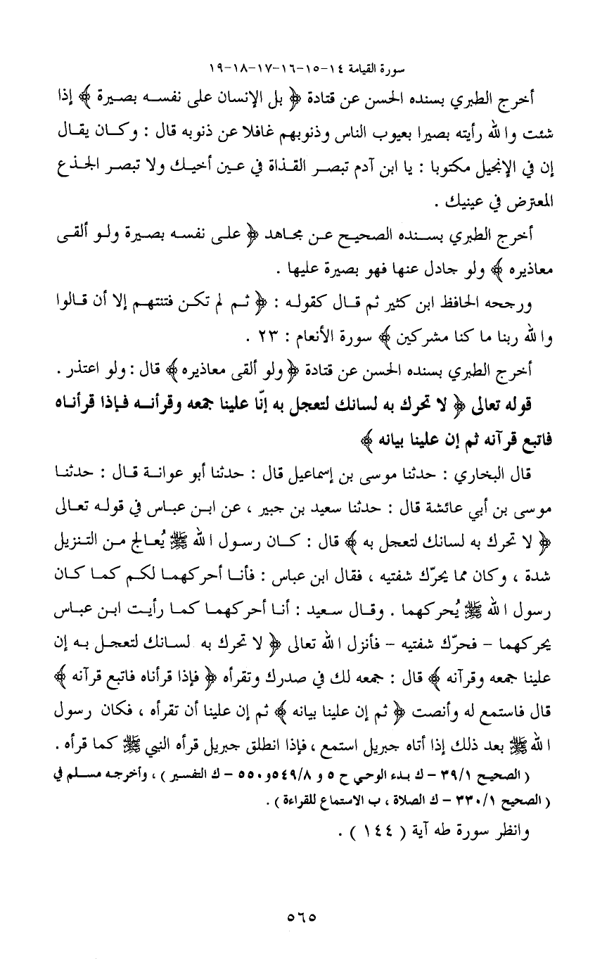قال البخاري: حدثنا موسى بن إسماعيل قال: حدثنا أبو عوانة قال: حدثنا موسى بن أبي عائشة قال: حدثنا سعيد بن جبير، عن ابن عباس في قوله تعالى (لا تحرك به لسانك لتعجل به) قال: كان رسول الله - صَلَّى اللَّهُ عَلَيْهِ وَسَلَّمَ - يُعالج من التنزيل شدة، وكان مما يحرّك شفتيه، فقال ابن عباس: فأنا أحركهما لكم كما كان رسول الله - صَلَّى اللَّهُ عَلَيْهِ وَسَلَّمَ - يُحركهما. وقال سعيد: أنا أحركهما كما رأيت ابن عباس يحركهما - فحرّك شفتيه - فأنزل الله تعالى (لا تحرك به لسانك لتعجل به إن علينا جمعه وقرآنه) قال: جمعه لك في صدرك وتقرأه (فإذا قرأناه فاتبع قرآنه) قال فاستمع له وأنصت (ثم إن علينا بيانه) ثم إن علينا أن تقرأه، فكان رسول الله - صَلَّى اللَّهُ عَلَيْهِ وَسَلَّمَ - بعد ذلك إذا أتاه جبريل استمع، فإذا انطلق جبريل قرأه النبي - صَلَّى اللَّهُ عَلَيْهِ وَسَلَّمَ - كما قرأه.