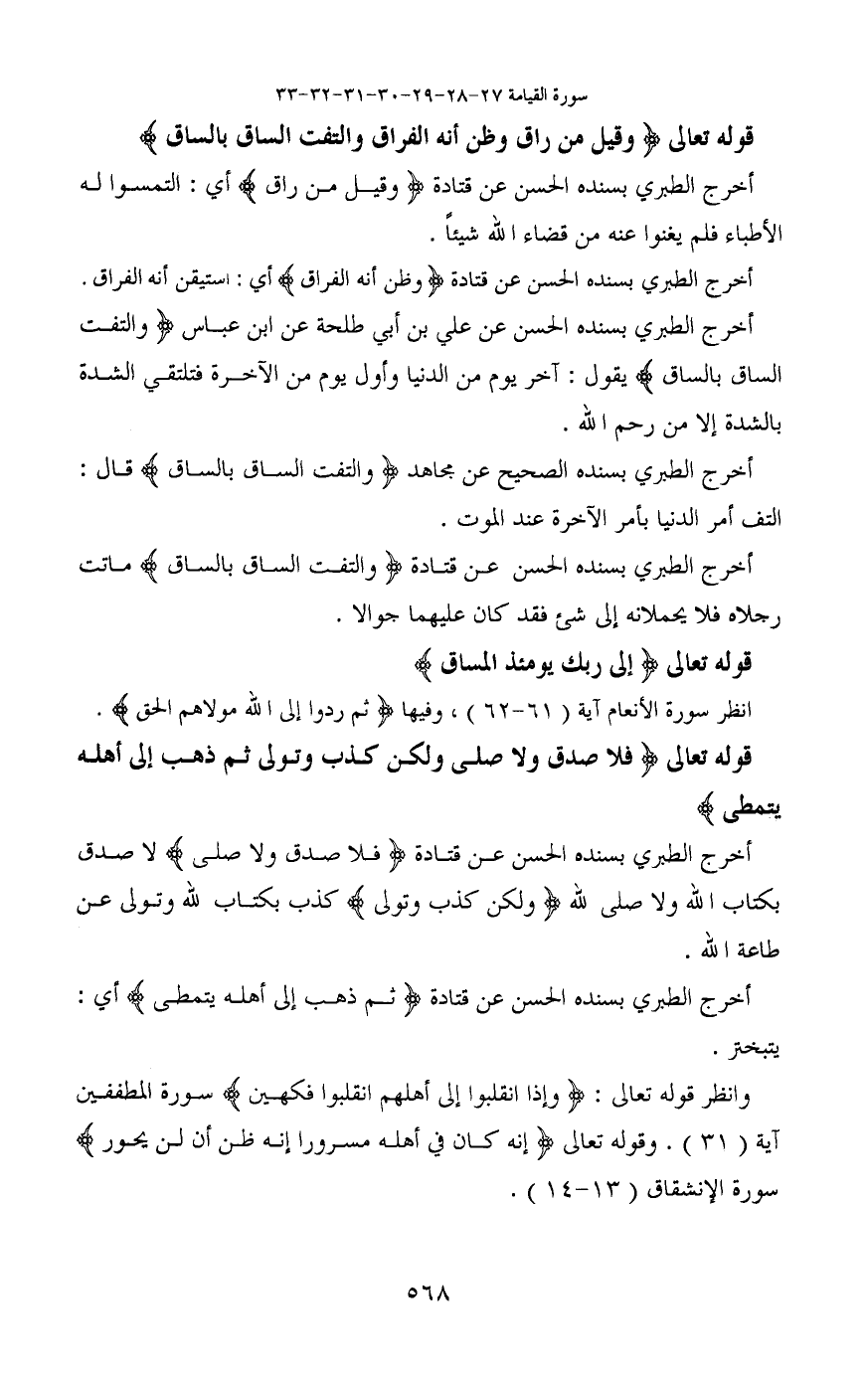 أخرج الطبري بسنده الصحيح عن مجاهد (والتفت الساق بالساق) قال: التف أمر الدنيا بأمر الآخرة عند الموت.