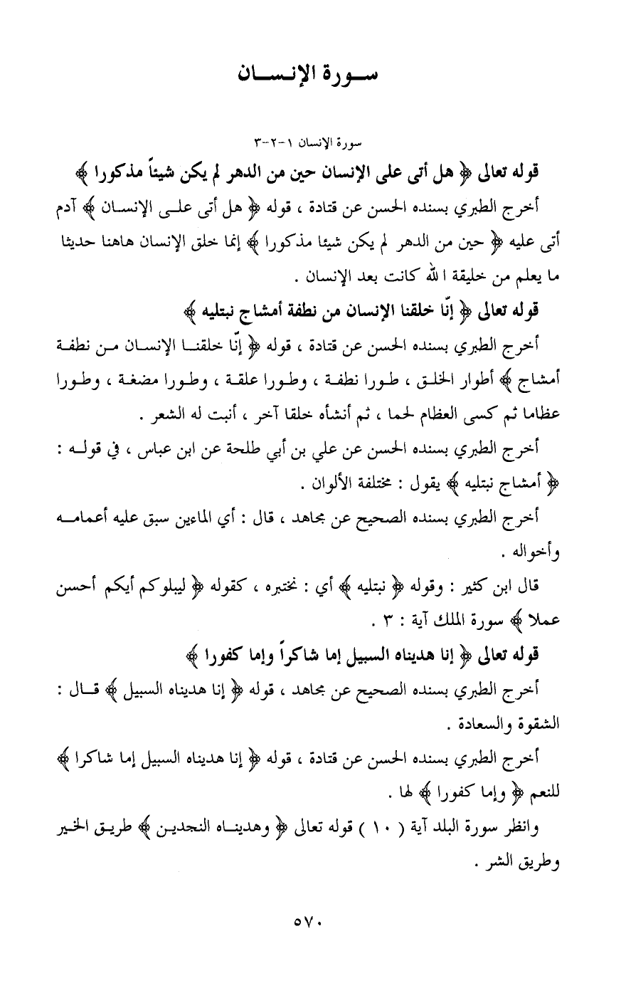 أخرج الطبري بسنده الحسن عن قتادة، قوله (إنّا خلقنا الإنسان من نطفة أمشاج) أطوار الخلق، طورا نطفة، وطورا علقة، وطورا مضغة، وطورا عظاما ثم كسى العظام لحما، ثم أنشأه خلقا آخر، أنبت له الشعر.