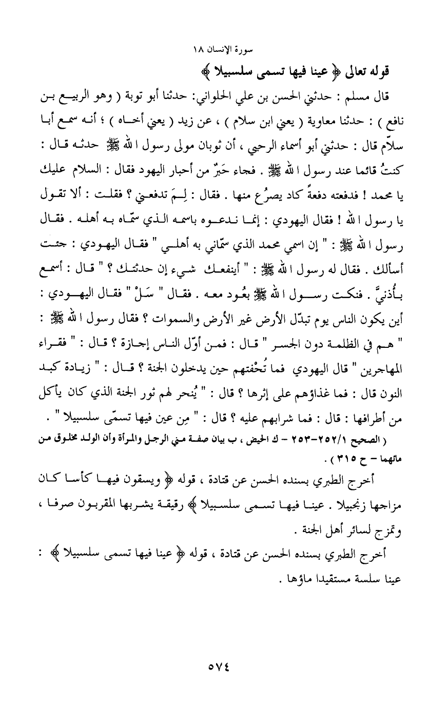قال مسلم: حدثني الحسن بن علي الحلواني: حدثنا أبو توبة (وهو الربيع بن نافع) : حدثنا معاوية (يعني ابن سلام) ، عن زيد (يعني أخاه) ؛ أنه سمع أبا سلاّم قال: حدثني أبو أسماء الرحبي، أن ثوبان مولى رسول الله - صَلَّى اللَّهُ عَلَيْهِ وَسَلَّمَ - حدثه قال: كنتُ قائما عند رسول الله - صَلَّى اللَّهُ عَلَيْهِ وَسَلَّمَ -. فجاء حَبر من أحبار اليهود فقال: السلام عليك يا محمد! فدفعته دفعة كاد يصرُع منها. فقال: لِمَ تدفعني؟ فقلت: ألا تقول يا رسول الله! فقال اليهودي: إنما ندعوه باسمه الذي سمّاه به أهله. فقال رسول الله - صَلَّى اللَّهُ عَلَيْهِ وَسَلَّمَ -: "إن اسمي محمد الذي سمّاني به أهلي" فقال اليهودي: جئت أسألك. فقال له رسول الله - صَلَّى اللَّهُ عَلَيْهِ وَسَلَّمَ -: "أينفعك شيء إن حدثتك؟ " قال: أسمع بأُذنيَّ. فنكت رسول الله - صَلَّى اللَّهُ عَلَيْهِ وَسَلَّمَ - بعُود معه. فقال "سَلْ" فقال اليهودي: أين يكون الناس يوم تبدّل الأرض غير الأرض والسموات؟ فقال رسول الله - صَلَّى اللَّهُ عَلَيْهِ وَسَلَّمَ -: "هم في الظلمة دون الجسر" قال: فمن أوّل الناس إجازة؟ قال: "فقراء المهاجرين" قال اليهودي فما تحْفتهم حين يدخلون الجنة؟ قال: "زيادة كبد النون قال: فما غذاؤهم على إثرها؟ قال: "يُنحر لهم ثور الجنة الذي كان يأكل من أطرافها: قال: فما شرابهم عليه؟ قال: "مِن عين فيها تسمّى سلسبيلا".