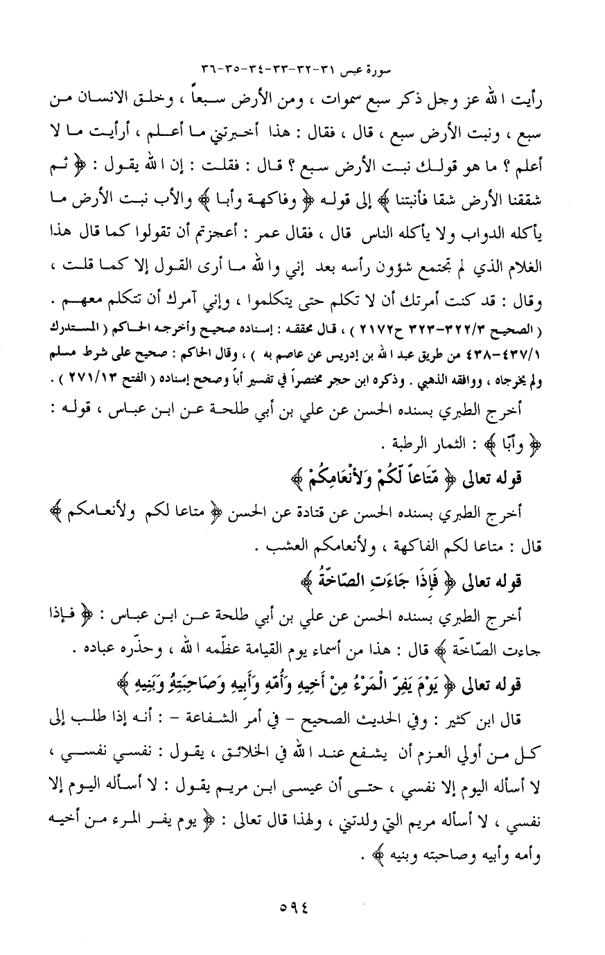رأيت الله عز وجل ذكر سبع سموات، ومن الأرض سبعاً، وخلق الإنسان من سبع، ونبت الأرض سبع، قال، فقال: هذا أخبرتني ما أعلم، أرأيت ما لا أعلم؟ ما هو قولك نبت الأرض سبع؟ قال: فقلت: إن الله يقول: (ثم شققنا الأرض شقا فأنبتنا) إلى قوله (وفاكهة وأبا) والأب نبت الأرض ما يأكله الدواب ولا يأكله الناس قال، فقال عمر: أعجزتم أن تقولوا كما قال هذا الغلام الذي لم تجتمع شؤون رأسه بعد إني والله ما أرىَ القول إلا كما قلت، وقال: قد كنت أمرتك أن لا تكلم حتى يتكلموا، وإني آمرك أن تتكلم معهم.
