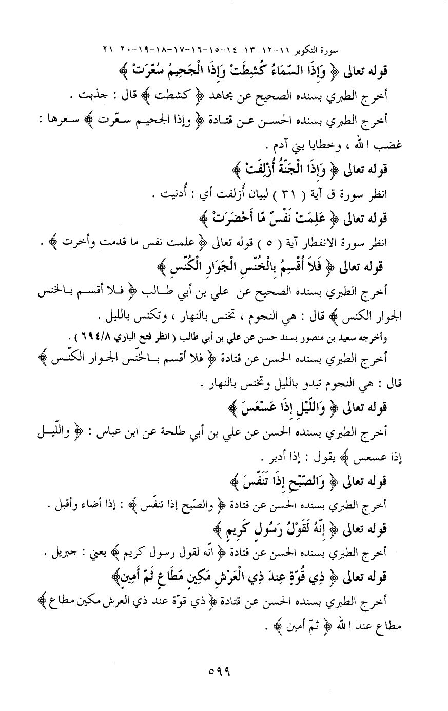 أخرج الطبري بسنده الحسن عن قتادة (فَلَا أُقْسِمُ بِالْخُنَّسِ (15) الْجَوَارِ الْكُنَّسِ) قال: هي النجوم تبدو بالليل: تخنس بالنهار.