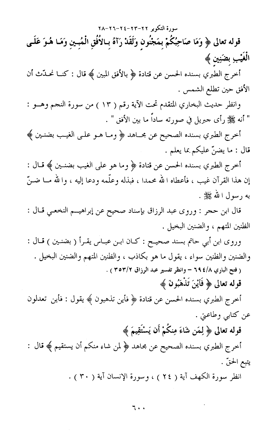 أخرج الطبري بسنده الحسن عن قتادة (وما هو على الغيب بضنين) قال: إن هذا القرآن غيب، فأعطاه الله محمدا، فبذله وعلّمه ودعا إليه، والله ما ضنّ به رسول الله - صَلَّى اللَّهُ عَلَيْهِ وَسَلَّمَ -.