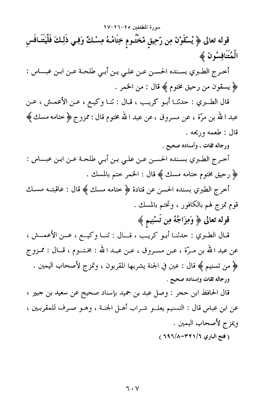 قال الحافظ ابن حجر: وصل عبد بن حميد بإسناد صحيح عن سعيد بن جبير، عن ابن عباس قال: التسنيم يعلو شراب أهل الجنة، وهو صرف للمقربين، ويمزج لأصحاب اليمين.