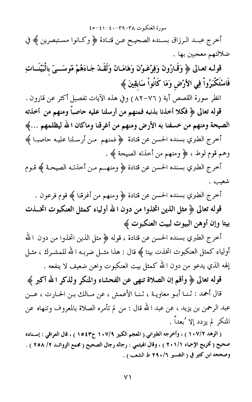 قوله تعالى (وأقم إن الصلاة تنهى عن الفحشاء والمنكر ولذكر الله أكبر) قال أحمد: ثنا أبو معاوية، ثنا الأعمش، عن مالك بن الحارث، عن عبد الرحمن بن يزيد، عن عبد الله قال: من لم تأمره الصلاة بالمعروف وتنهاه عن المنكر لم يزدد إلاُ بعداً.