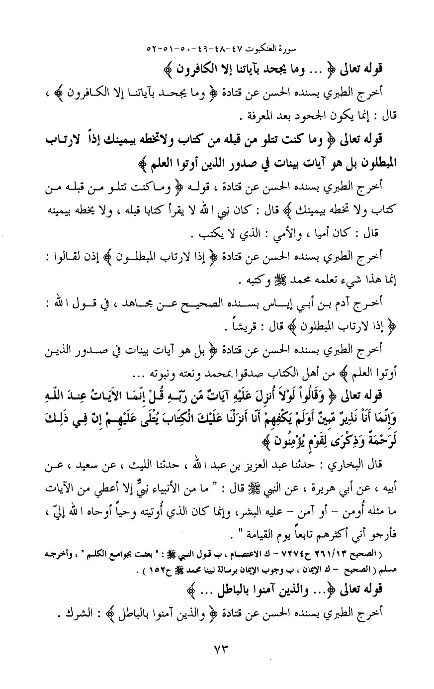 أخرج الطبري بسنده الحسن عن قتادة، قوله (وما كنت تتلو من قبله من كتاب ولا تخطه بيمينك) قال: كان نبي الله لا يقرأ كتابا قبله، ولا يخطه بيمينه قال: كان أميا، والأمي: الذي لا يكتب.