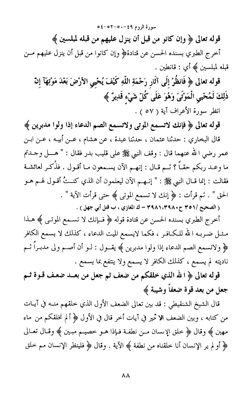 قوله تعالى (فَإِنَّكَ لَا تُسْمِعُ الْمَوْتَى وَلَا تُسْمِعُ الصُّمَّ الدُّعَاءَ إِذَا وَلَّوْا مُدْبِرِينَ) قال البخاري: حدثنا عثمان، حدثنا عبدة، عن هشام، عن أبيه، عن ابن عمر رضي الله عنهما قال: وقف النبي - صَلَّى اللَّهُ عَلَيْهِ وَسَلَّمَ - على قليب بدر فقال: "هل وجدتم ما وعد ربكم حقاً؟ " ثم قال: "إنهم الآن يسمعون ما أقول". فذكر لعائشة فقالت: إنما قال النبي - صَلَّى اللَّهُ عَلَيْهِ وَسَلَّمَ -: "إنهم الآن ليعلمون أن الذي كنتُ أقول لهم هو الحق". ثم قرأت: (إنك لا تسمع الموتى) حتى قرأت الآية".