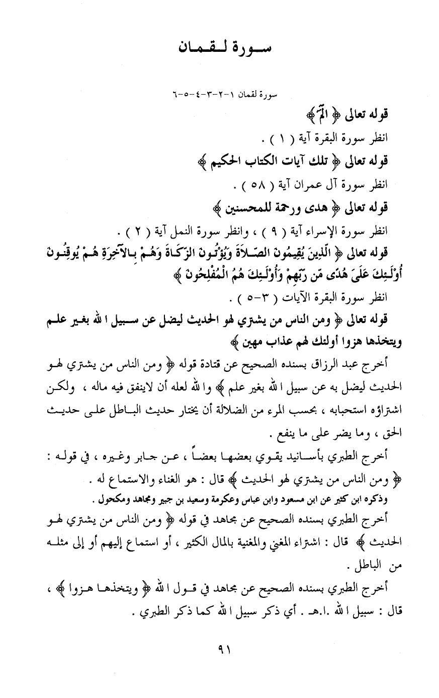 أخرج عبد الرزاق بسنده الصحيح عن قتادة قوله (ومن الناس من يشتري لهو الحديث ليضل به عن سبيل الله بغير علم) والله لعله أن لا ينفق فيه ماله، ولكن اشتراؤه استحبابه، بحسب المرء من الضلالة أن يختار حديث الباطل على حديث الحق، وما يضر على ما ينفع.