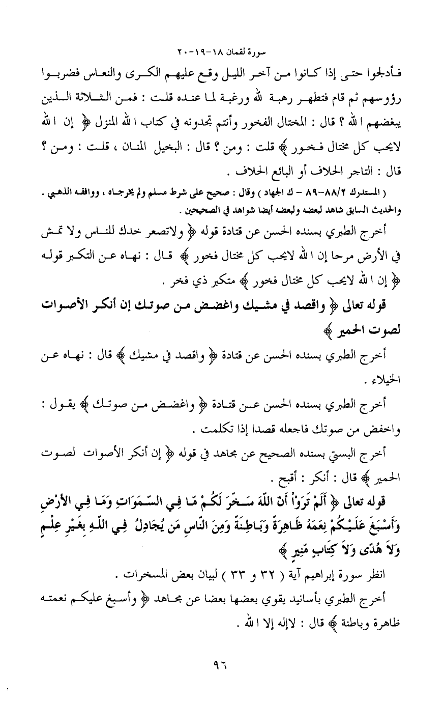 أخرج الطبري بسنده الحسن عن قتادة قوله (وَلَا تُصَعِّرْ خَدَّكَ لِلنَّاسِ وَلَا تَمْشِ فِي الْأَرْضِ مَرَحًا إِنَّ اللَّهَ لَا يُحِبُّ كُلَّ مُخْتَالٍ فَخُورٍ) قال: نهاه عن التكبر قوله (إن الله لا يحب كل مختال فخور) متكبر ذي فخر.