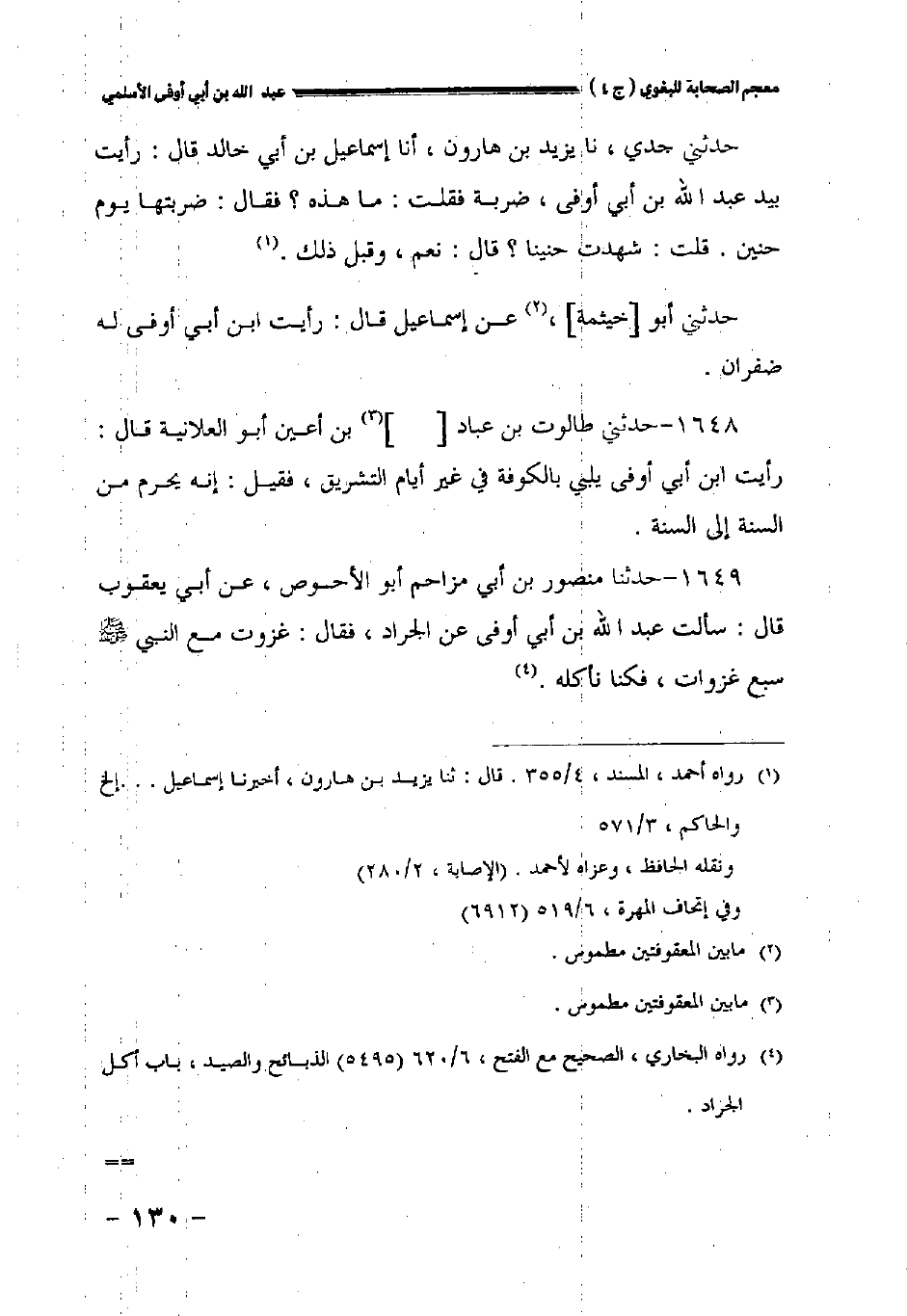 حدثني جدي نا يزيد بن هارون أنا إسماعيل بن أبي خالد قال: رأيت بيد عبد الله بن أبي أوفي ضربة فقلت: ما هذه؟ فقال: ضربتها يوم حنين. قلت: شهدت حنينا؟ قال: نعم وقبل ذلك.