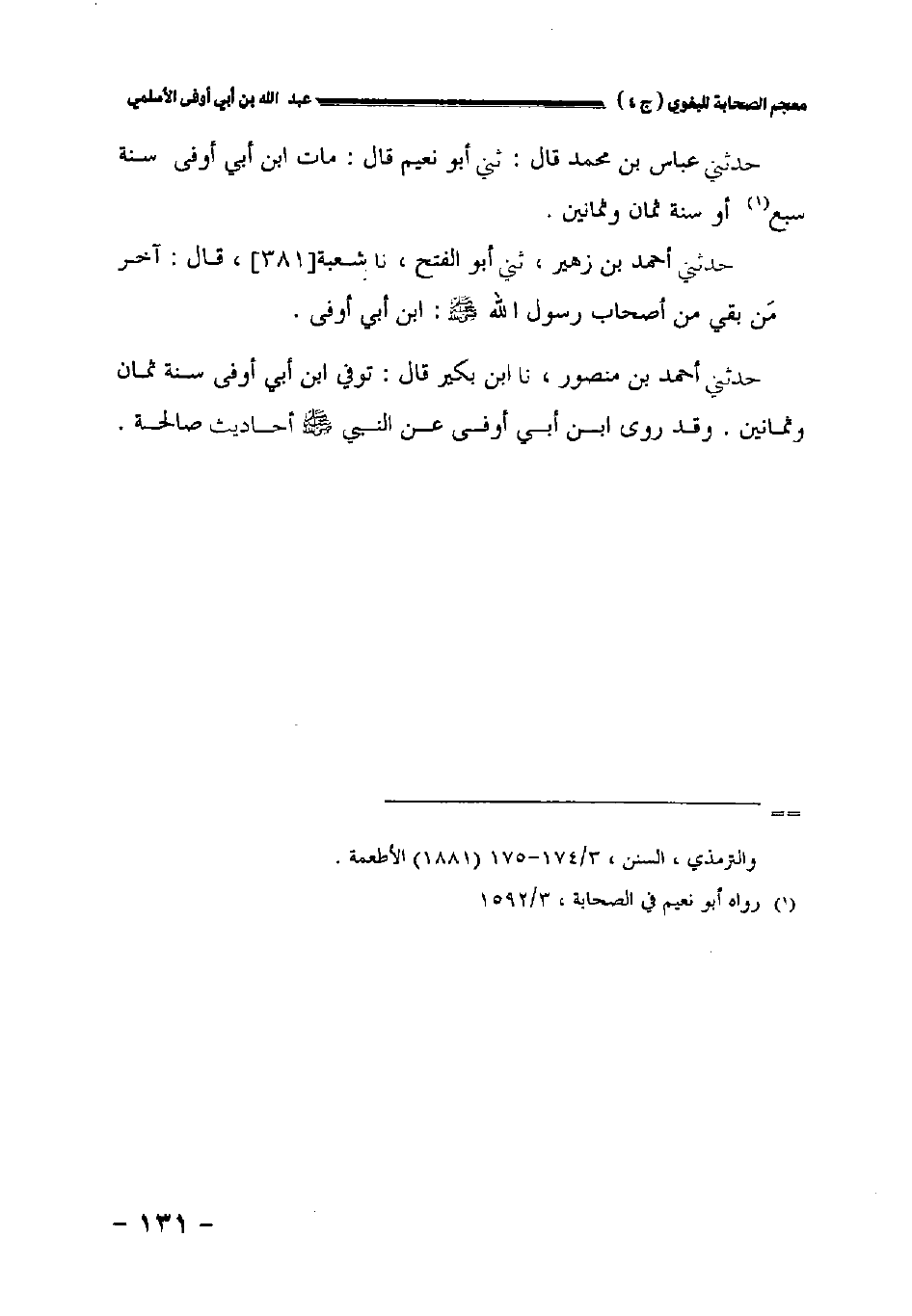 حدثني أحمد بن زهير حدثني أبو الفتح نا شعبة//٣٨١// قال: آخر من بقي من أصحاب رسول الله صلى الله عليه وسلم: ابن أبي أوفى.