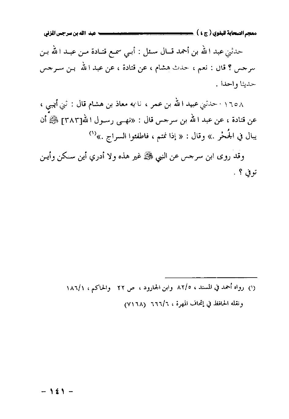 حدثني عبد الله بن أحمد قال سئل أبي سمع قتادة من عبد الله بن سرجس؟ قال: نعم حدث هشام عن قتادة عن عبد الله بن سرجس حديثا واحدا.