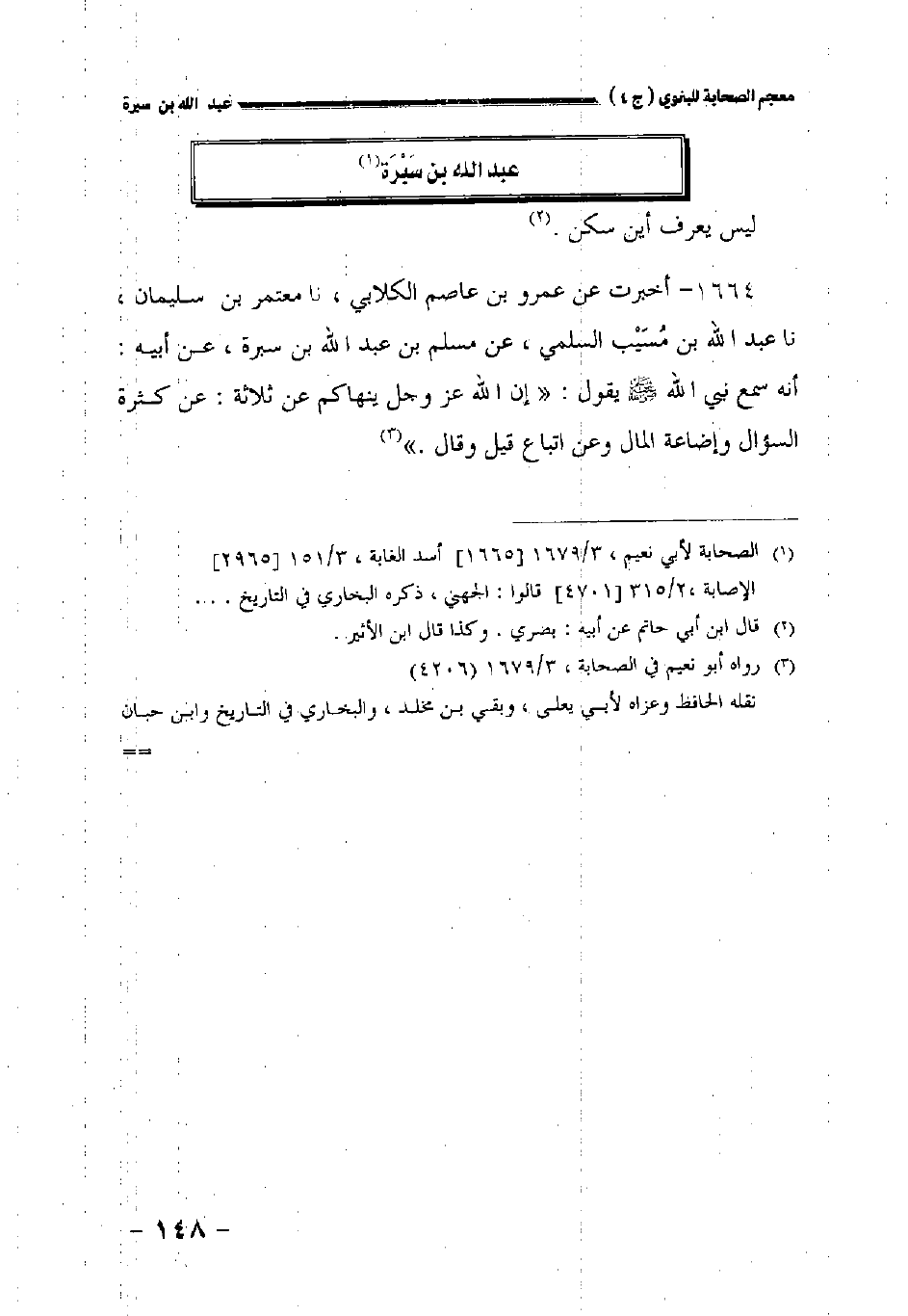 ١٦٦٤ - أخبرت عن عمرو بن عاصم الكلابي نا معتمر بن سليمان نا عبد الله بن مسيب السلمي عن مسلم بن عبد الله بن سبرة عن أبيه: أنه سمع نبي الله صلى الله عليه وسلم يقول: " إن الله عز وجل ينهاكم عن ثلاثة: عن كثرة السؤال وإضاعة المال وعن اتباع قيل وقال.