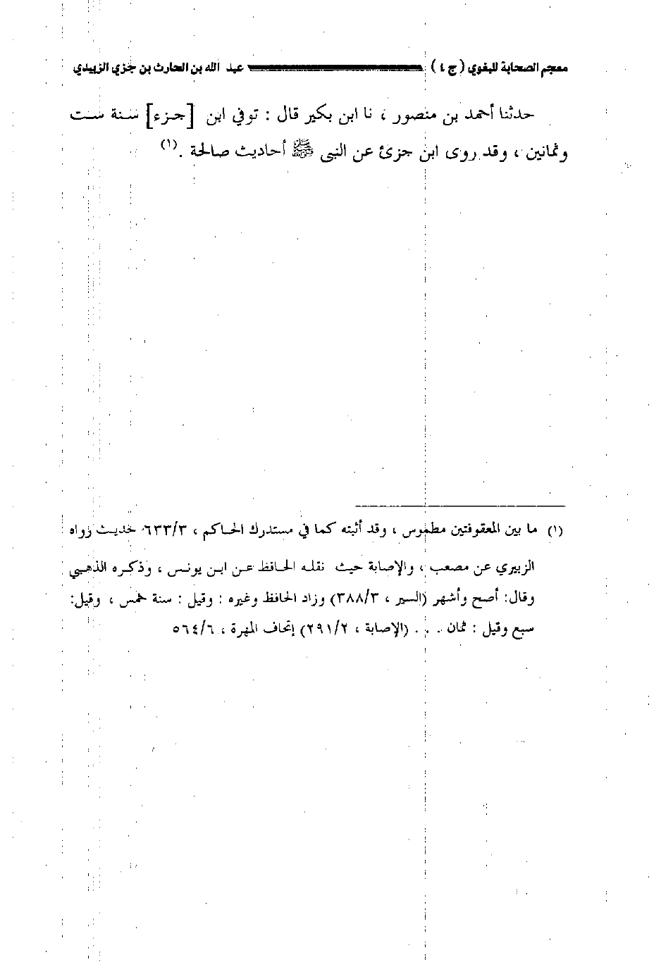 حدثنا أحمد بن منصور نا ابن بكير قال: توفي ابن [جزء] سنة ست وثمانين وقد روى ابن جزىء عن النبي صلى الله عليه وسلم أحاديث صالحة.