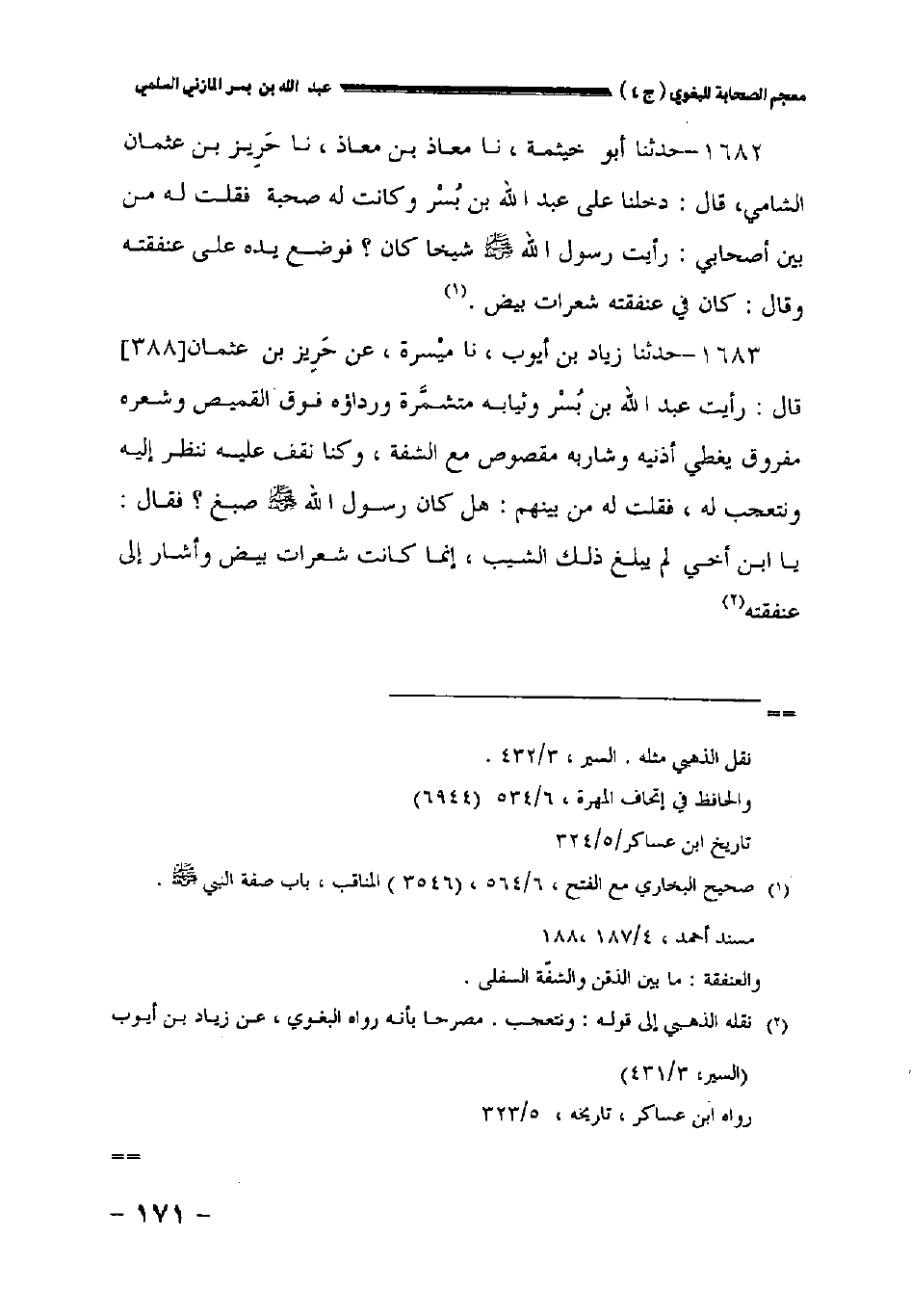 ١٦٨٢ - حدثنا أبو خيثمة نا معاذ بن معاذ نا حريز بن عثمان الشامي قال: دخلنا على عبد الله بن بسر وكانت له صحبة فقلت له من بين أصحابي: رأيت رسول الله صلى الله عليه وسلم شيخا كان؟ فوضع يده على عتفقته وقال: كان في عنفقته شعرات بيض.