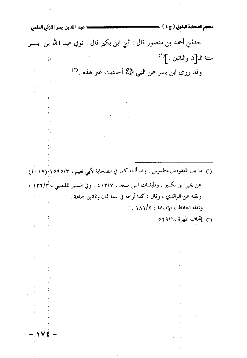 حدثني أحمد بن منصور قال: ثني ابن بكير قال: توفي عبد الله بن بسر سنة ثما [ن وثمانين].