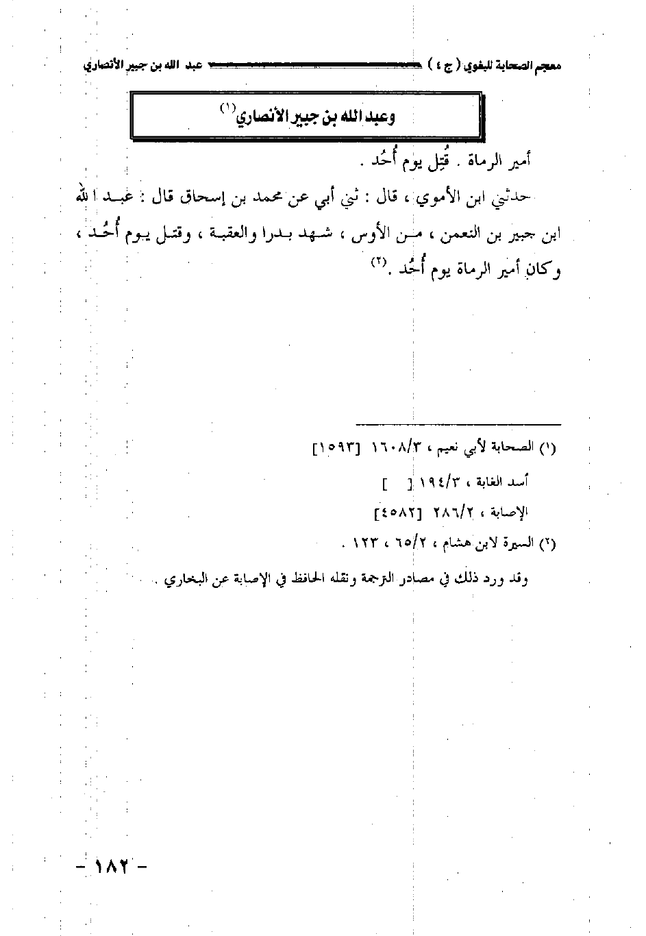 حدثني ابن الأموي قال: حدثني أبي عن محمد بن إسحاق قال: عبد الله بن جبير بن النعمان من الأوس شهد بدرا والعقبة وقتل يوم أحد وكان أمير الرماة يوم أحد.