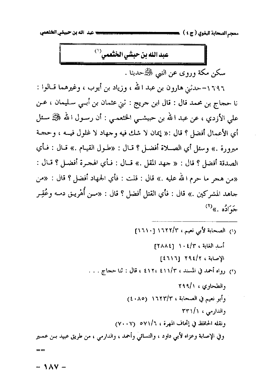 ١٦٩٦ - حدثني هاورن بن عبد الله وزياد بن أيوب وغيرهما قالوا: نا حجاج بن محمد قال: قال ابن جريج: حدثني عثمان بن أبي سليمان عن علي الأزدي عن عبد الله بن حبيشي الخثعمي: أن رسول الله صلى الله عليه وسلم سئل أي الأعمال أفضل؟ قال: " إيمان لا شك فيه وجهاد لا غلول فيه وحجة مبرورة " وسئل أي الصلاة أفضل؟ قال: " طول القيام " قال: فأي الصدقة أفضل؟ قال: " جهد المقل " قال: فأي الهجرة أفضل؟ قال: " من هجر ما حرم الله عليه " قال: قلت: فأي الجهاد أفضل؟ قال: " من جاهد المشركين " قال: فأي القتل أفضل؟ قال: " من أهريق دمه وعقر جواده ...
