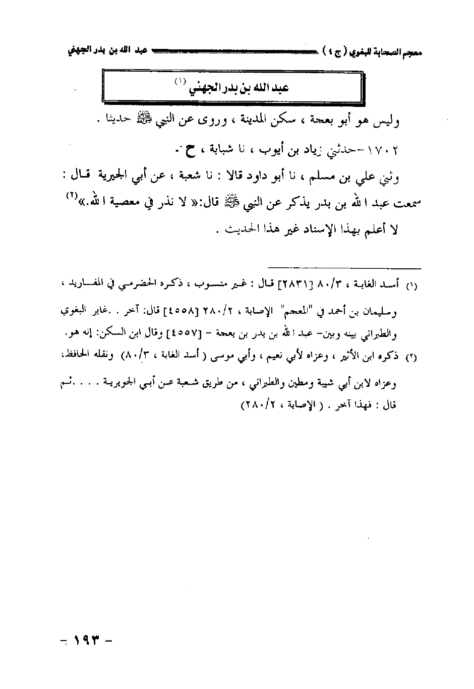 وحدثني علي بن مسلم نا أبو داود قالا: نا شعبة عن أبي الجبرية قال: سمعت عبد الله بن بدر يذكر عن النبي صلى الله عليه وسلم قال: " لا نذر في معصية الله.