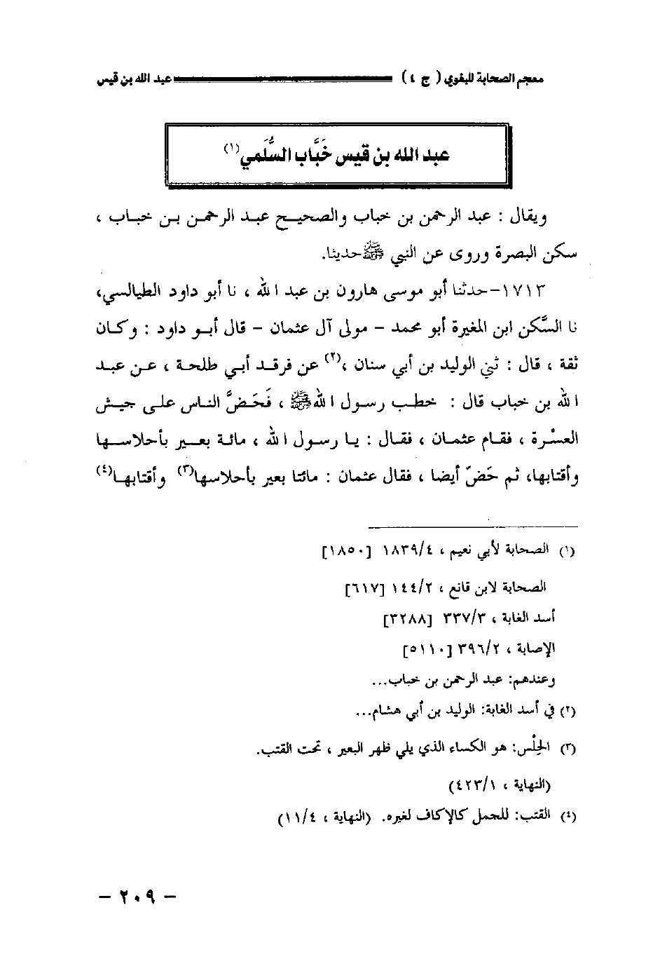 ١٧١٣ - حدثنا أبو موسى هارون بن عبد الله نا أبو داود الطيالسي نا السكن ابن المغيرة أبو محمد - مولى آل عثمان - قال أبو داود: وكان ثقة قال: حدثني الوليد بن أبي سنان عن فرقد أبي طلحة عن عبد الله بن خباب قال: خطب رسول الله صلى الله عليه وسلم فحض الناس على جيش العسرة فقام عثمان فقال: يا رسول الله مائة بعير بأحلاسها وأقتابها ثم حض أيضا فقال عثمان: مائتا بعير بأحلاسها وأقتابها