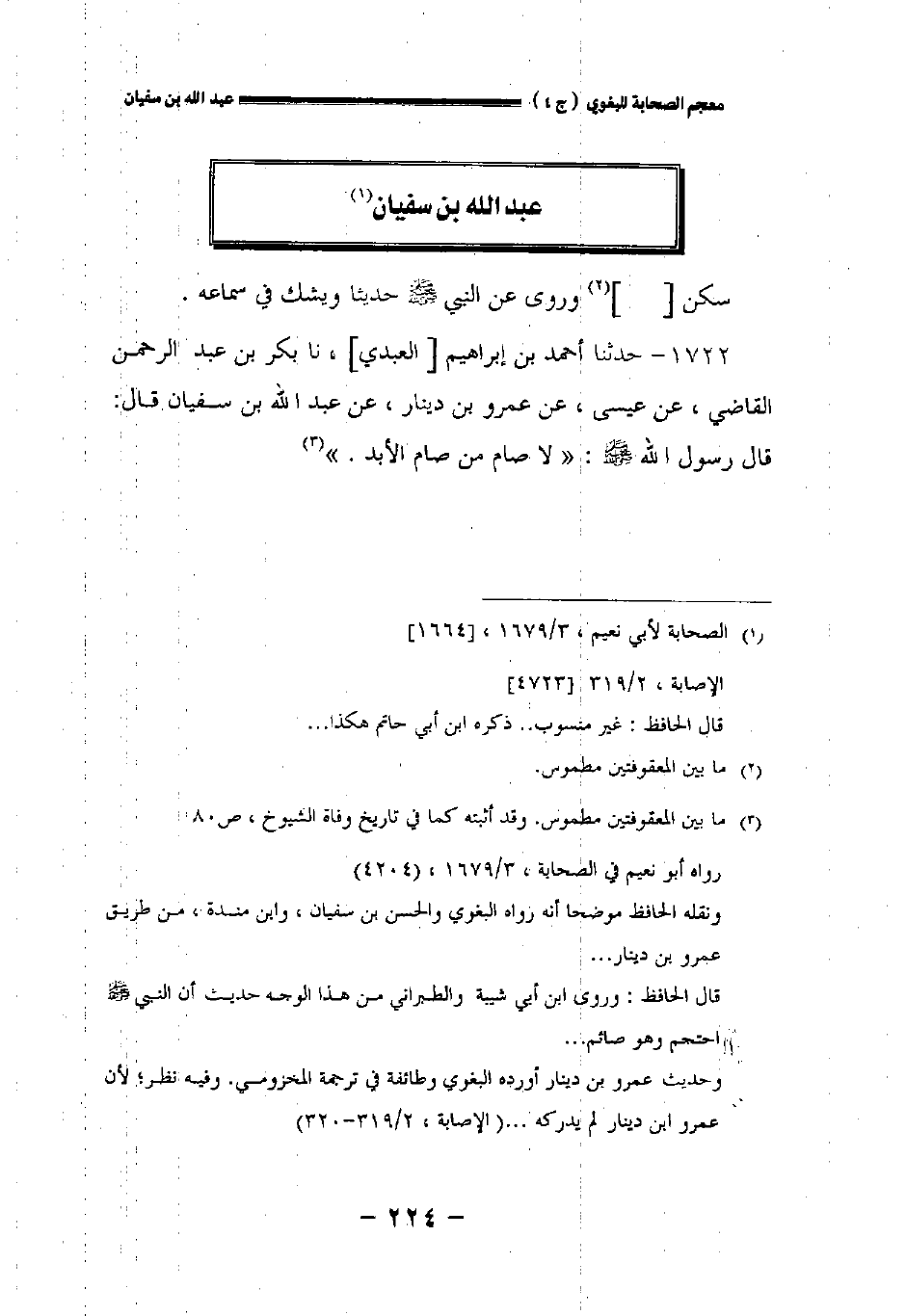 ١٧٢٢ - حدثنا أحمد بن إبراهيم [العبدي] نا بكر بن عبد الرحمن القاضي عن عيسى عن عمرو بن دينار عن عبد الله بن سفيان قال: قال رسول الله صلى الله عليه وسلم: " لا صام من صام الأبد.