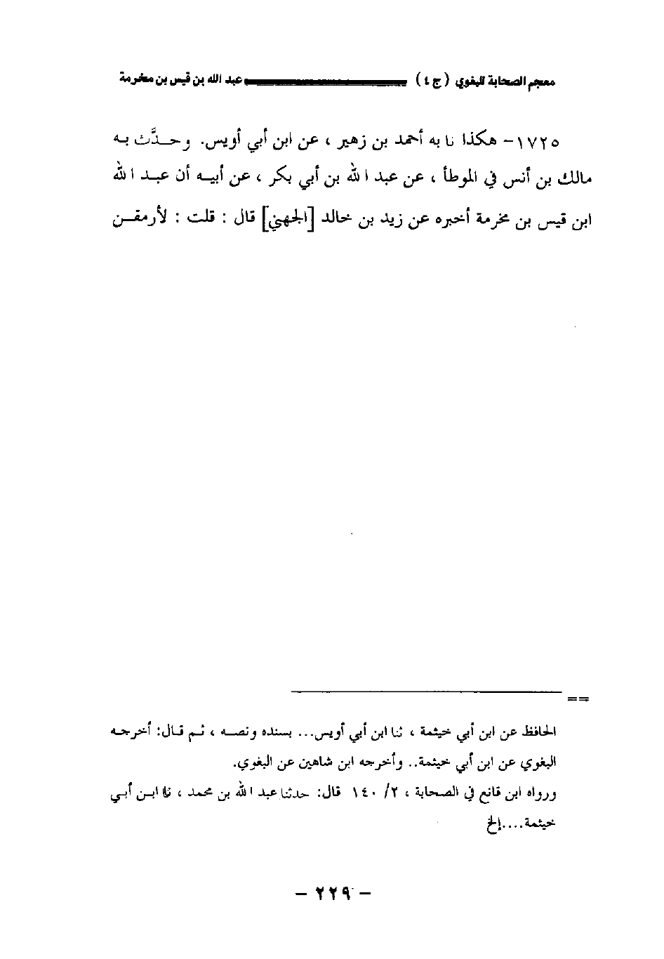 ١٧٢٥ - هكذا نا به أحمد بن زهير عن ابن أبي أويس وحدث به مالك بن أنس في الموطأ عن عبد الله بن أبي بكر عن أبيه أن عبد الله بن قيس بن مخرمة أخبره عن زيد بن خالد [الجهني] قال: قلت: لأرمقن