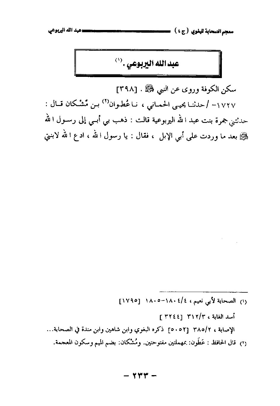١٧٢٧ - حدثنا يحيى الحماني نا عطوان بن مشكان قال: حدثتني جمرة بنت عبد الله اليربوعية قالت: ذهب بي أبي إلى رسول الله صلى الله عليه وسلم بعد ما وردت على أبي الإبل فقال: يا رسول الله ادع الله لابنتي