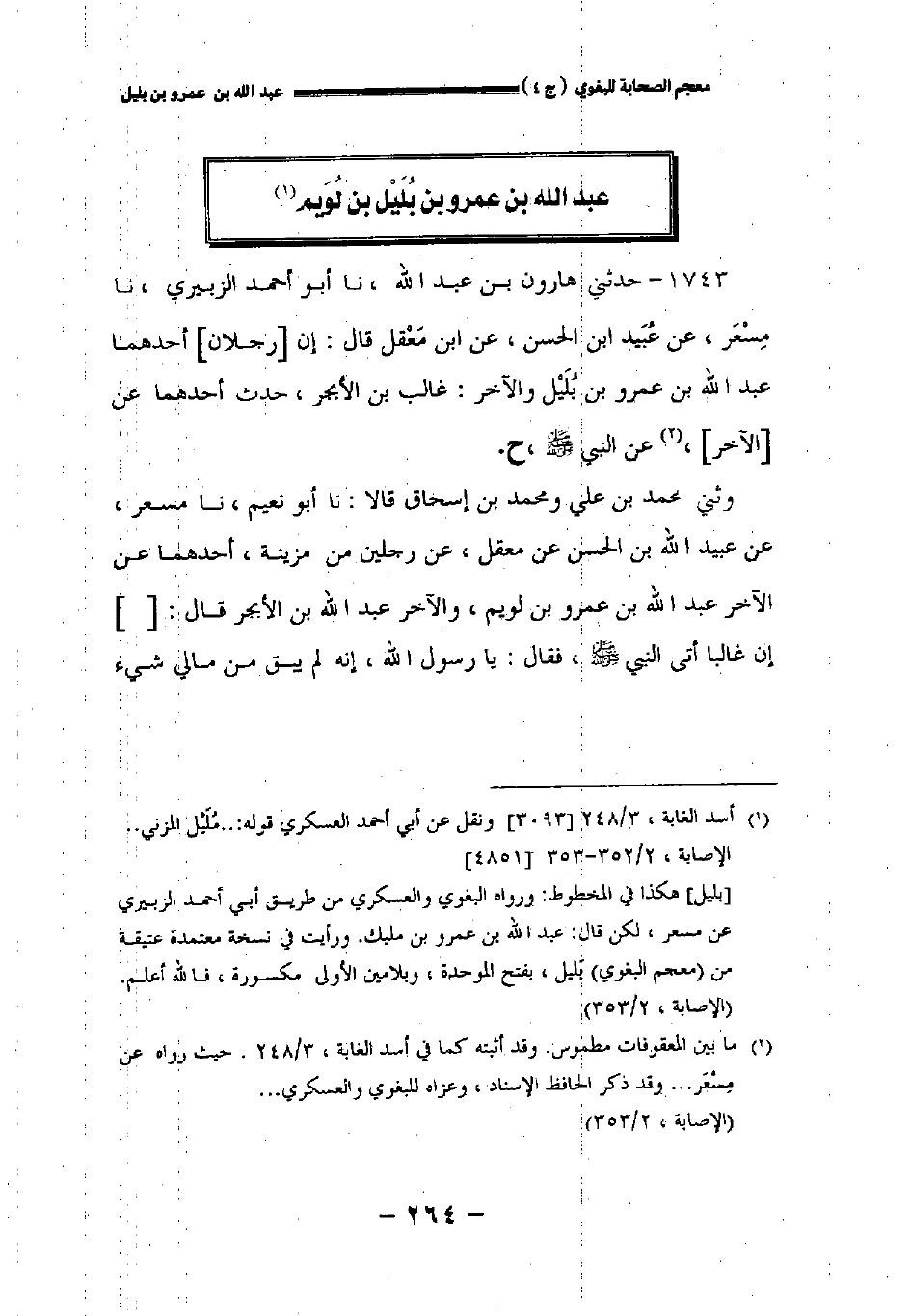 ١٧٤٣ - حدثني هارون بن عبد الله نا أبو أحمد الزبيري نا مسعر عن عبيد بن الحسن عن ابن معقل قال: إن [رجلان] أحدهما عبد الله بن عمرو بن بليل والآخر: غالب بن الأبجر حدث أحدهما عن [الآخر] عن النبي صلى الله عليه وسلم ح.
