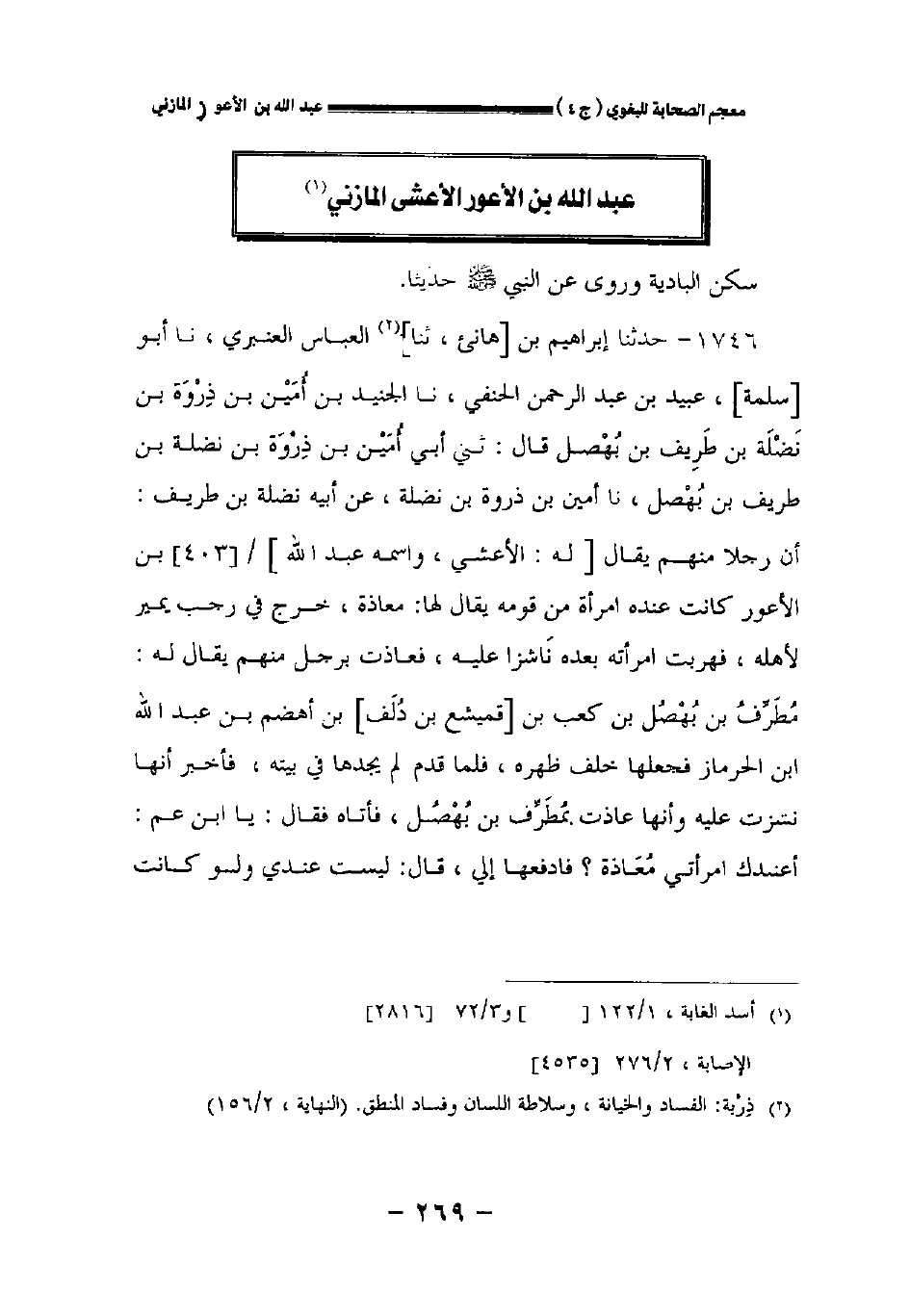 ١٧٤٦ - حدثنا إبراهيم بن [هانىء، حدثنا] العباس العنبري نا أبو [سلمة] عبيد بن عبد الرحمن الحنفي نا الجنيد بن أمين بن ذروة بن نضلة بن طريف بن بُهْصل قال: حدثني أبي أُمَيْن بن ذروة بن نضلة بن طريف بن بهصل نا أمين بن ذروة بن نضلة عن أبيه نضلة بن طريف: أن رجلا منهم يقال [له: الأعشى واسمه عبد الله //٢٠٤//] بن الأعور كانت عنده امرأة من قومه يقال لها: معاذة خرج في رجب يمير لأهله فهربت امرأته بعده ناشزا عليه فعاذت برجل منهم يقال له: مطرف بن بهصل بن كعب بن [قميشع بن دُلَف] بن أهضم بن عبد الله بن الحرماز فجعلها خلف ظهره فلما قدم لم يجدها في بيته فأخبر أنها نشزت عليه وأنها عاذت بمطرف بن بُهصل فأتاه فقال: يا ابن عم: أعندك امرأتي معاذة؟ فادفعها إلي، قال: ليست عندي ولو كانت