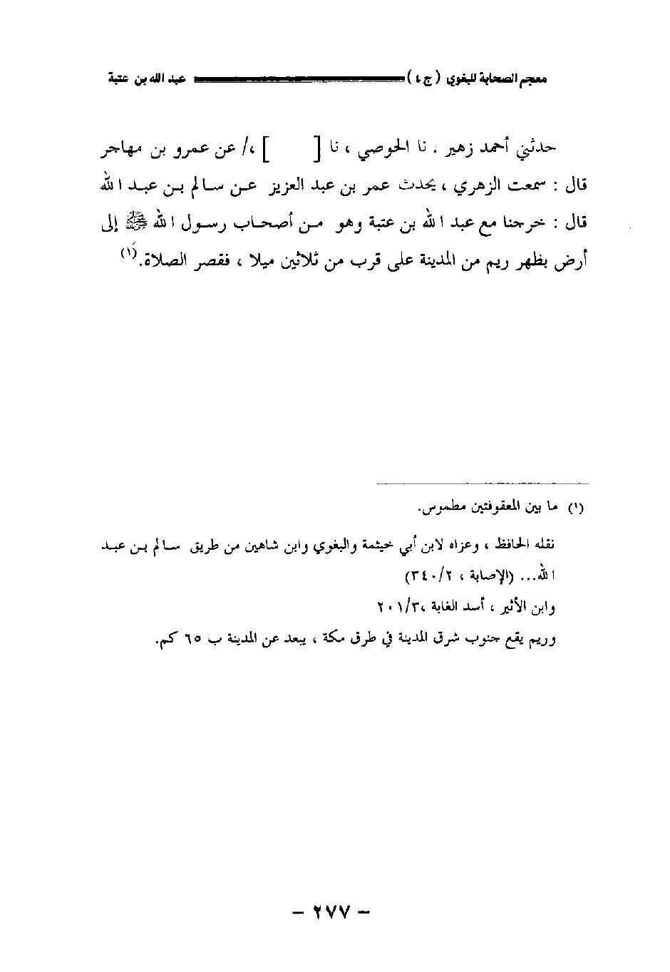 حدثني أحمد زهير نا الحوصي نا []، //٤٠٤//عن عمرو بن مهاجر قال: سمعت الزهري يحدث عمر بن عبد العزيز عن سالم بن عبد الله قال: مر هنا مع عبد الله بن عتبة وهو من أصحاب رسول الله صلى الله عليه وسلم إلى أرض بظهر ريم من المدينة على قرب من ثلاثين ميلا فقصر الصلاة.